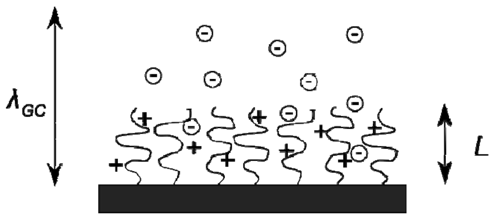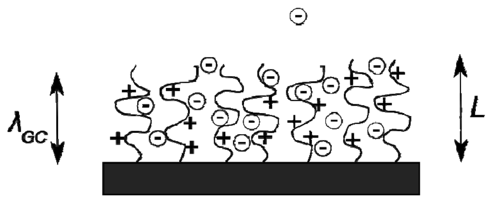 When a polymer brush is formed from strong or weak polyelectrolyte molecules, electrostatic interactions introduce a rich variety of behavioural regimes in addition to the neutral brush properties [18]. At typical values of grafting density (σg = 0.4 nm−2) and degree of polymerisation (N ∼ 250), even a modestly charged polymer brush has a significant surface charge density, and therefore binds a layer of counterions in the vicinity of the surface. The binding of the counterion layer is dependent upon the surface charge density and is characterised by the Gouy-Chapman length λGC [18], which describes the length scale within which the counterions are largely confined to the surface, see Figure 5. A brush of charge fraction α, grafting density σg and degree of polymerisation N has a surface charge density of αNeσg so that