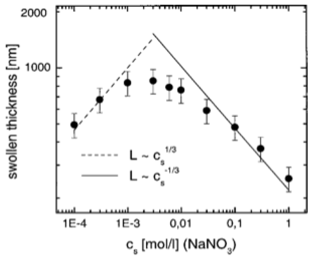 A key work on the determination of the structure of polyelectrolyte brushes was published by Tran (1999) [45], where the PS-PSSNa synthesis route was again used. Ellipsometry was used to determine dry layer thicknesses, allowing the calculation of the grafting density from the known molecular weight of the polymer. Infrared spectroscopy was used to characterise the chemical structure of brush and neutron reflectivity in liquid (water/deuterated water depending on the contrast matching required) was used to characterise density profiles of both monomers and counterions in the brush. It was shown that the brush height was not dependent on grafting density—as is characteristic of the osmotic brush regime, and also that for fixed grafting density the brush height scaled as H ∼ N as expected for the osmotic regime. The counterion profile was shown to closely resemble the monomer density profile. For an electroneutral brush this is confirmation that the counterions are confined inside the brush, and exerting a strong osmotic pressure to counterbalance the conformational elasticity of the chains. The study also considered the addition of salt. For low salt concentrations (lower than the concentration of counterions inside the brush) there was no screening of electrostatic interactions within the brush and it thus stayed in the osmotic regime. However, higher salt concentrations were shown to decrease the brush height as a function of salt concentration to the power −1, which compares favourably to the scaling theory for both weak and strong polyelectrolyte brushes in the salted brush regime. It is interesting to note that at high salt concentrations (5 mol L−1 NaCl) the brush was not collapsed, such that it had expelled solvent and was close to its dry thickness, but was just as stretched as a neutral polymer brush in a good solvent.