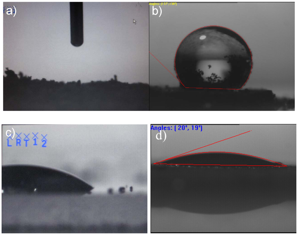 After plasma treatment the MWCNTs mass was measured and the sample was separated into two groups, with one group for surface characterization and another for the MWCNT reinforced epoxy nanocomposite preparation. Contact angle measurement results showed the plasma nanocoating induced a significant change in surface energies of MWCNTs. Without plasma nanocoating, the pressed MWCNT pellet completely absorbed the water droplets placed on the pellet surface for contact angle measurements (Figure 3(a)). This phenomenon was probably due to oxidized defects existed on the MWCNT surface. Such oxidized defects are commonly found on carbon nanotube surfaces and would render the MWCNTs hydrophilic [9,25]. After the plasma coating MWCNTs became hydrophobic and had water contact angles averaging to 137° (Figure 3(b)). The plasma coating could provide a hydrophobic surface on the MWCNTs by encapsulating the MWCNTs and thus covering their hydrophilic oxidized defects. Surface contact angle measurements were also performed using Epon 815C resin in order to achieve a better understanding of the interactions of the MWCNTs with the epoxy matrix. When Epon 815C resin droplets came into contact with the surface of the uncoated MWCNT pellets, the resin was slowly absorbed into the MWCNTs and it took about 10 ∼ 15 s. Figure 3(c) shows the Epon 815C droplet image on the pressed pellet of untreated MWCNTs. In contrast, the pressed pellet of plasma coated MWCNTs quickly and completely absorbed the Epon 815C resin droplet in ∼3 s, which was much faster than that on untreated MWCNTs. Figure 3(d) shows the Epon 815C resin droplet image that was taken within 1 s after it was placed on the pellet surface pressed from plasma coated MWCNTs. Penetration of the epoxy resin into the pressed pellet and quick spreading of the epoxy resin on the pellet surface were clearly observed from Figure 3(d).