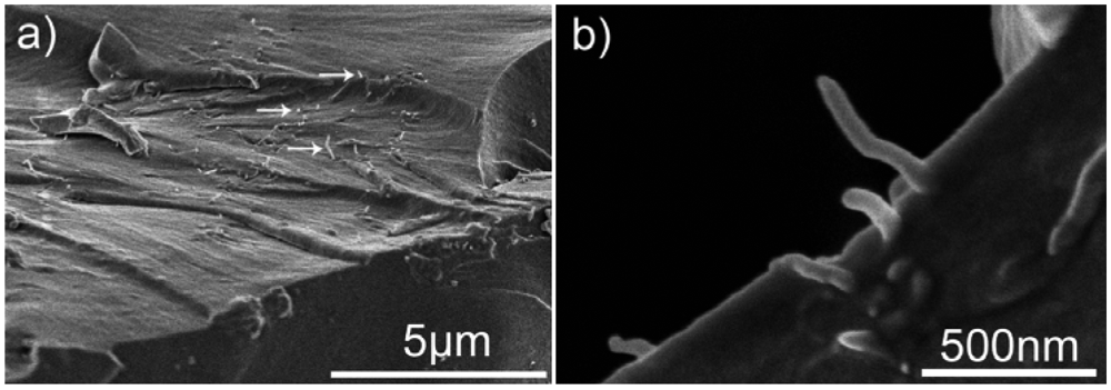 Fracture surfaces of epoxy nanocomposite reinforced with untreated MWCNTs were examined under high resolution HR SEM and no fiber pullout was found. In some samples aggregates of untreated MWCNTs were observed in the fracture surface, although these were rare occurrences. Figure 7 shows a representative SEM image with fiber pullout on the fracture surface of plasma nanocoated MWCNT reinforced epoxy nanocomposite samples. MWCNT loading in the epoxy was relatively small and gave infrequent pullout; however pullout was observed over most of the mirrored fracture surface. The average diameter of the plasma nanocoated MWCNTs found on the fracture surface was around 50 nm, much larger than the diameter of the original 10–30 nm MWCNTs. TEM images show the plasma nanocoating on the MWCNTs was less than 1 nm as seen in Figure 4 and the platinum coating was less than 5 nm. This result implies that the remaining 8 nm was due to the epoxy binding to the plasma nanocoated MWCNT surfaces. The strong bonding observed is believed to be from covalent bonding between the amines on the plasma nanocoated MWCNTs and the Epon 815C resin through interfacial interaction mechanism illustrated in Figure 1. The tortuous nature of MWCNTs is believed to be a factor in the length of the fiber pullout.