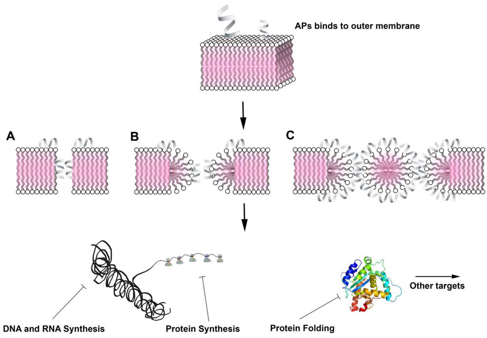 The proposed mechanism of action for APs in bacteria. APs are proposed to associate with the negatively charged surface of the outer membrane. The listed models explaining the mechanisms of membrane permeabilization include: (A) barrel-stave: the peptides aggregate and insert into the membrane bilayer in order to align the hydrophobic peptide regions with the lipid core region. The hydrophilic peptide regions form the inner core of the pore. (B) Toroidal: the peptides aggregate and induce the lipid monolayers to bend continuously through the pore so that the water core is lined by both the inserted peptides and the lipid head groups. (C) Carpet channel: the peptides disrupt the membrane by orienting parallel to the surface of the lipid bilayer and forming an extensive layer or carpet. The net effect of A to C is that some monomers will be translocated into the cytoplasm and can dissociate from the membrane and bind to cellular polyanions such as DNA and RNA, inhibit enzymatic activity such as protein synthesis or chaperone assisted protein folding. Modified from Brodgen et al. [46].