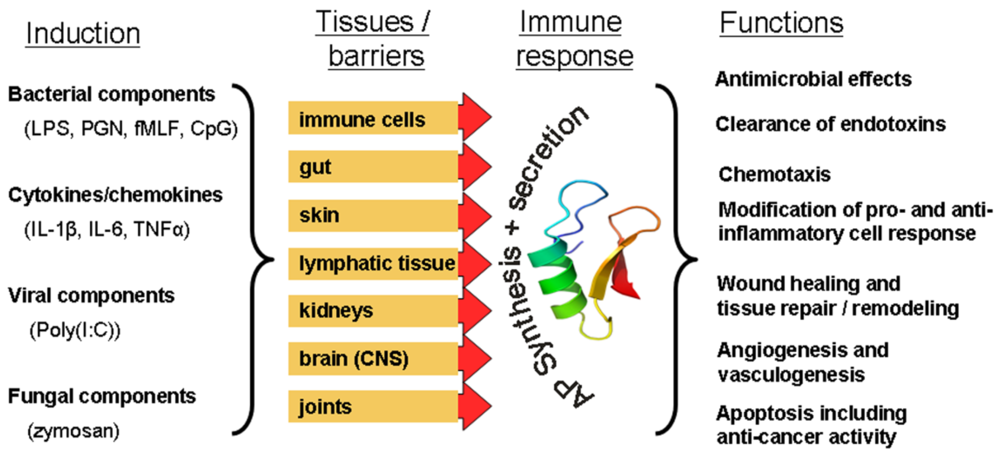 APs also modify pro- and anti-inflammatory cytokine expression to modulate immune response. They influence the balance between induction of inflammation, and at the same time protect the organism from the detrimental effects of an excessive inflammatory response. For example, LL-37 induces potent pro-inflammatory cytokines such as tumor necrosis factor-α (TNF-α) and interleukin-1β (IL-1β) in immune and non-immune cells, as well as anti-inflammatory cytokines such as IL-10 in brain glial cells or macrophages [90,91]. Furthermore LL-37 suppresses pro-inflammatory response, including both extracellular neutralization the bacterial cell wall component lipopolysaccharide (LPS) and inhibition of LPS-induced cellular response such as TNF-α, nitric oxide and prostaglandin E2 [92,93]. The cytokines themselves are able to increase or decrease AP expression. While TNF-α, IL-1β and IL-6 lead to an increase in the expression of cathelicidin and defensin, IL-10 depresses AP production [10,20,94,95].