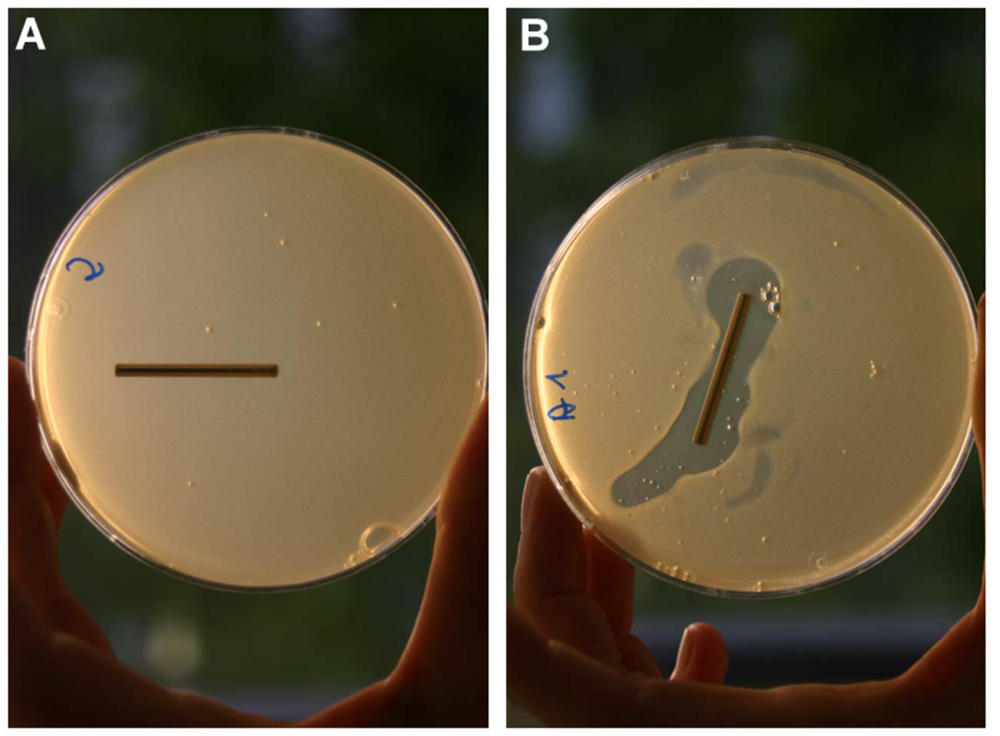 HBD-2-coated Kirschner-wire used for fracture fixation shows antimicrobial activity against Gram-negative bacteria. The wire was coated with poly-DL-lactide (PDLLA) (A) or PDLLA and HBD-2 (3 μg) (B), and the antibacterial activity against the Gram-negative bacterium Pseudomonas aeruginosa was tested using agar diffusion test. For description of the agar diffusion test please see [10]. Briefly, bacterial suspension was mixed with underlay agar, poured into Petri dishes, and the Kirschner-wire was inserted. After overnight incubation at 37 °C, overlay agar was poured onto the underlay agar. Agar plates were incubated at 37 °C for 4 h and the growth inhibition zones were examined.