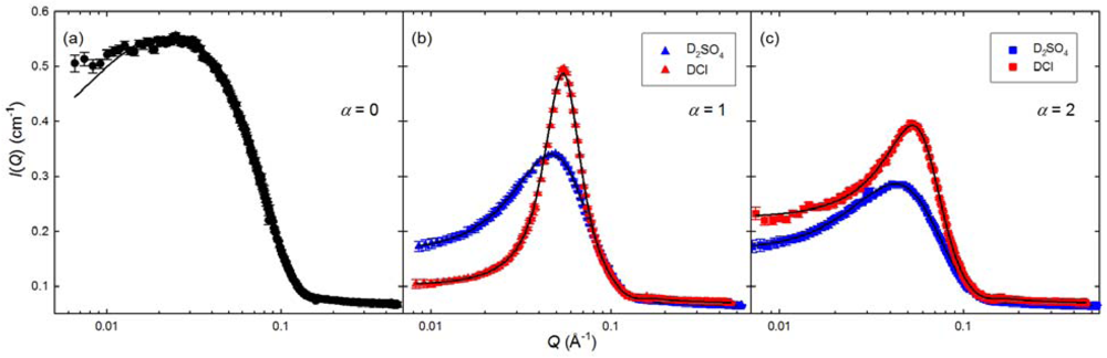 Figure 2 presented Liu et al.’s work [26] for this data analysis methodology, which is an experiment for PAMAM dendrimers at three different levels of pH values (molecular protonation levels α = 0 (Figure 2(a)), 1 (Figure 2(b)), and 2 (Figure 2(c))) and two different acids (blue symbols: deuterated sulfuric acid, and red symbols: deuterium chloride). It shows the good agreement between SANS intensities and model fitting results.