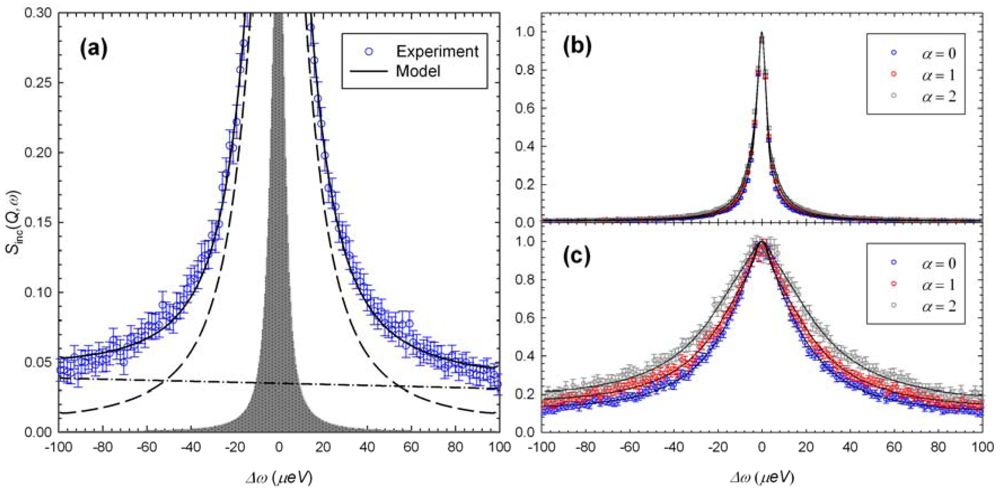 (a) Quasi-elastic neutron scattering (QENS) intensity (blue symbols) recorded at Q = 0.9 Å−1, the total fitted curve (solid line), the corresponding components of translational diffusion (shaded area), the Lorentzian (dashed line) and background (dash-dotted line); (b) The dependence of the QENS intensity on α obtained at Q = 0.5 Å−1 and (c) at Q = 1.3 Å−1 (Reproduced by permission of The Royal Society of Chemistry. http://pubs.rsc.org.libproxy.rpi.edu/en/Content/ArticleLanding/2011/SM/c0sm00671h).
