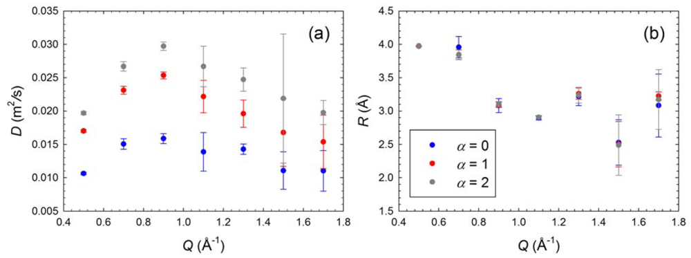 They used the diffusion coefficient D and the sphere radius R to describe the confined diffusive motion of dendrimers. QENS measurements show invariant R at different protonation levels specified by α or pD values (Figure 4(b)) [34]. However, as seen from Figure 4(a) (the diffusion coefficient at different protonation levels: blue dots as the protonation level of α = 0, red dots as α = 1, and grey dots as α = 2), the diffusion coefficients of α = 2 are higher than that of α = 1, and the diffusion coefficients of α = 1 are higher than that of α = 0. This tells us despite the fluctuations at different Q values, the internal diffusion coefficient D is seen to increase steadily with the increase in dendrimer protonation [34].