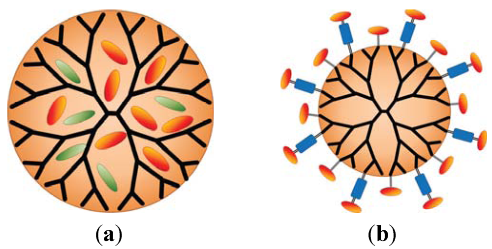 (a) Schematic drawing of a dendrimer carrier encapsulating hydrophobic drug molecules in the dendrimer’s voids to increase their aqueous solubility and control their release rate; (b) Schematic drawing showing a dendrimer-drug conjugate where the drug molecules (red ovals) are either directly coupled (solid lines) to dendrimer’s surface groups or are coupled via a pH sensitive linkage (blue rectangle) (Reprinted (adapted) with permission from Medina, S.H. and El-Sayed, M.E., Dendrimers as carriers for delivery of chemotherapeutic agents. Chem Rev., 2009. 109 (7): p. 3141-57. Copyright 2012 American Chemical Society).
