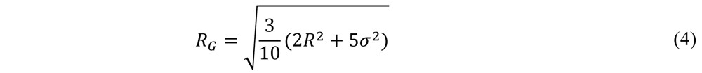 where A is the scattering contrast between dendrimer particles and the solvent depending on the contrast, particle number density, and the particle volume, P(Q), the normalized intra-dendrimer structure factor, and S(Q), the inter-dendrimer structure factor. By assuming a diffuse interface between the solvent and dendrimer, P(Q) is given by the modified fuzzy ball model which approximates the PAMAM molecular density profile by the convolution of a hard sphere with radius R and a Gaussian with variance σ2 characterizing the soft shell region [13,22,23], and S(Q) is obtained by numerically solving the OZ integral equation for one component system in combination with the hypernetted chain (HNC) closure [24]. The effective inter-dendrimer interaction is approximated by the screened Coulombic potential and the essential physical quantities characterizing the charged PAMAM solutions, such as the effective charge carried by a single PAMAM dendrimer and the ionic strength, which can be converted from the fitted potential parameters based on the generalized one-component macroion approach (GOCM) [25]. In this approach, the radius of gyration RG can be calculated and expressed as a simple analytical function of R and σ: