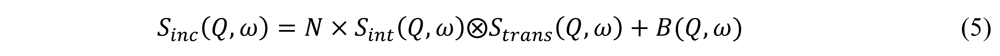 , the global translational diffusion. The Debye-Waller factor, sample scattering strength, and all the other factors corresponding to the normalization of the scattering intensity are collected into the parameter N. B(Q, ω) is the energy-dependent background that has been fitted with a linear function.