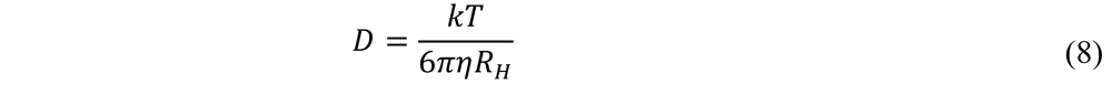 Dynamic light scattering (DLS) is also widely used for studying the structure of macromolecules [36,38,39,40,41,42]. The measured data in DLS experiment are the correlation curve. Embodied within the correlation curve is all of the information regarding the diffusion of particles within the sample being measured. The diffusion coefficient (D) is calculated by fitting the correlation curve to an exponential function, with D being proportional to the lifetime of the exponential decay. Different mathematical approaches can be employed to determine D, such as: the cumulant method [43] and CONTIN algorithm [44]. D will then be used to calculate the hydrodynamic radius (RH) of dendrimers through the Stokes–Einstein equation.