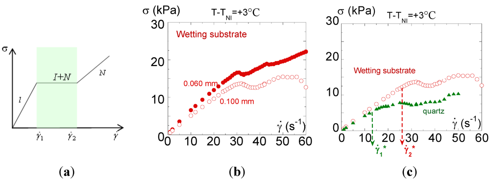 Figure 4(b,c) displays the shear stress versus steady-state shear rate curve of PANO2 at +3 °C above the NI transition temperature measured at two different gap thicknesses (using the same alumina substrate) or using two different substrates (the total wetting alumina and a partial wetting substrate quartz) respectively. In the isotropic phase, in absence of shear-induced phase, low degree of polymerization SCLCPs are expected to behave as Newtonian fluids, i.e., the viscosity (defined by the ratio: η = σ/