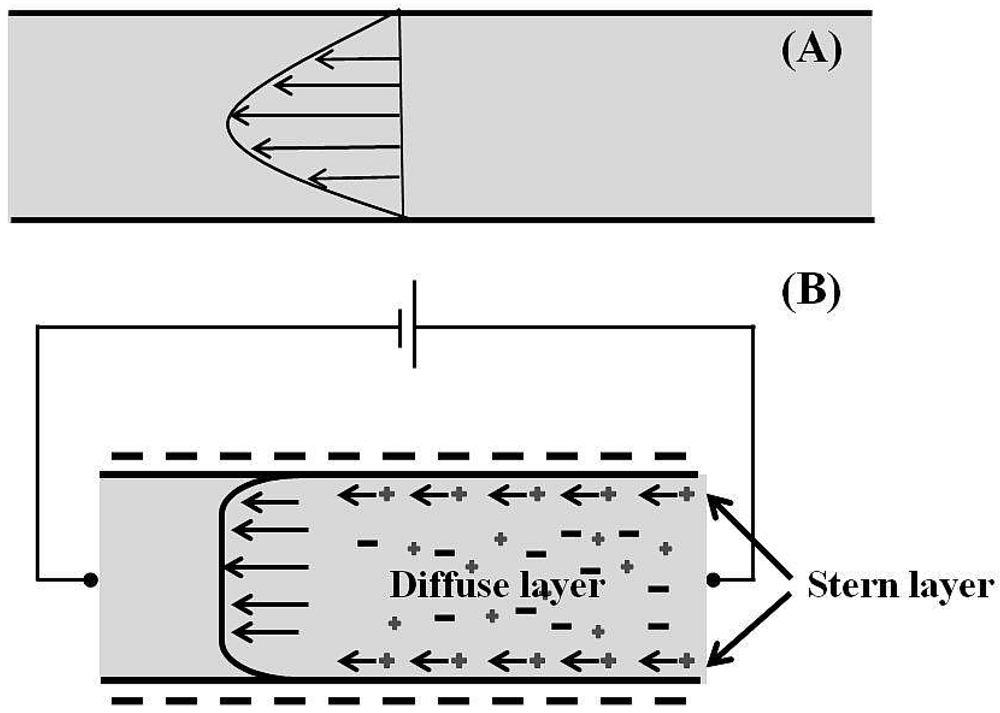 The fluid flow profile within the microfluidic channels. (A) Pseudo-parabolic profile in pressure-driven flow;(B) Uniform velocity profile in electro-osmotic driven flow.