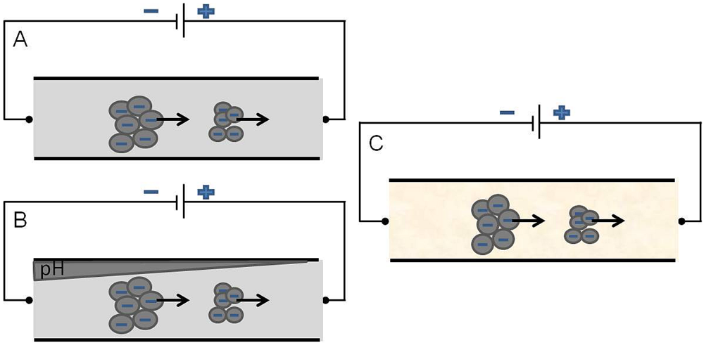 Electrophoresis approaches within microfluidic systems. (A) Sample movement in free solution;(B) Electrofocusing;(C) Gel electrophoresis.