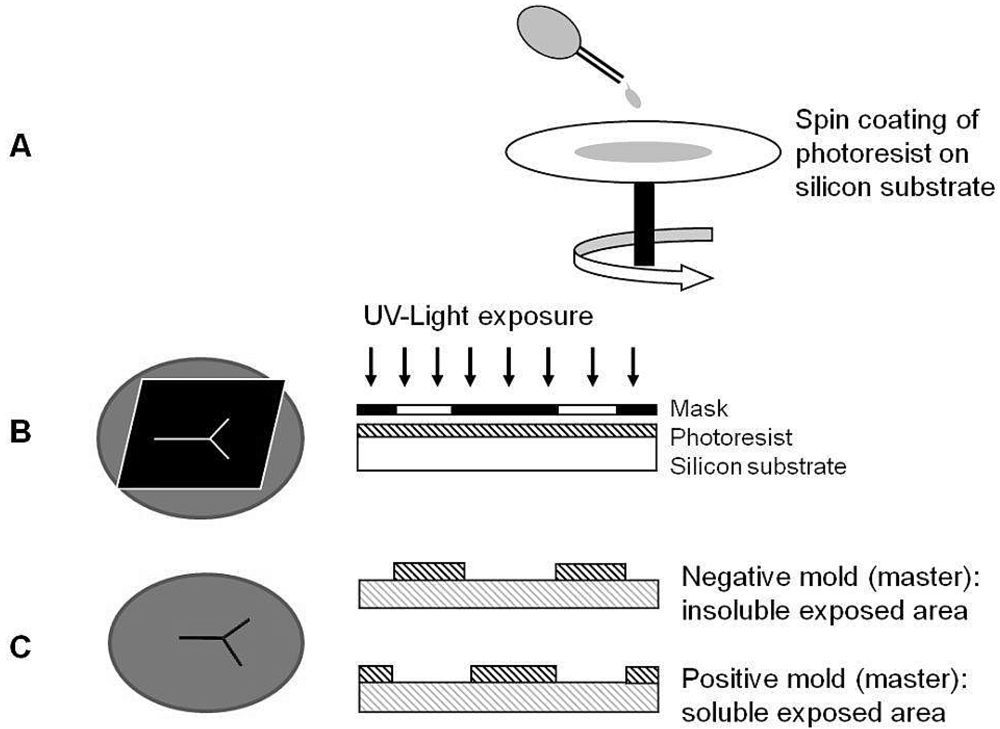 Photolithography to fabricate microfluidic devices. (A) A photoresist is spin-coated on a silicon substrate;(B) The substrate with the spin-coated layer of photoresist is exposed to UV light through a high-resolution mask;(C) After baking and chemical development, the non-cross-linked material is removed, resulting in either a negative or a positive mold.