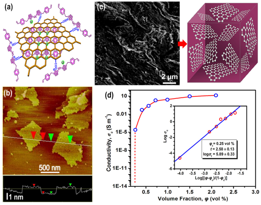 (a) Structural illustration for VbimBr-functionalized grapheme; (b) AFM image of VbimBr-functionalized graphene sheets on a mica substrate and its corresponding height profile along the given line; (c) SEM image for freeze-fractured cross-sections of graphene/PMMA composite at 2.08 vol % loading and the proposed dispersion pattern of graphene sheets in the matrix; and (d) Electrical conductivity (σc) versus filler volume fraction (φ) for the composites. Inset shows a log-log plot of σc versus (φ–φc)/(1–φc). Reproduced with permission from [62].Copyright 2012 the Royal Society of Chemistry.