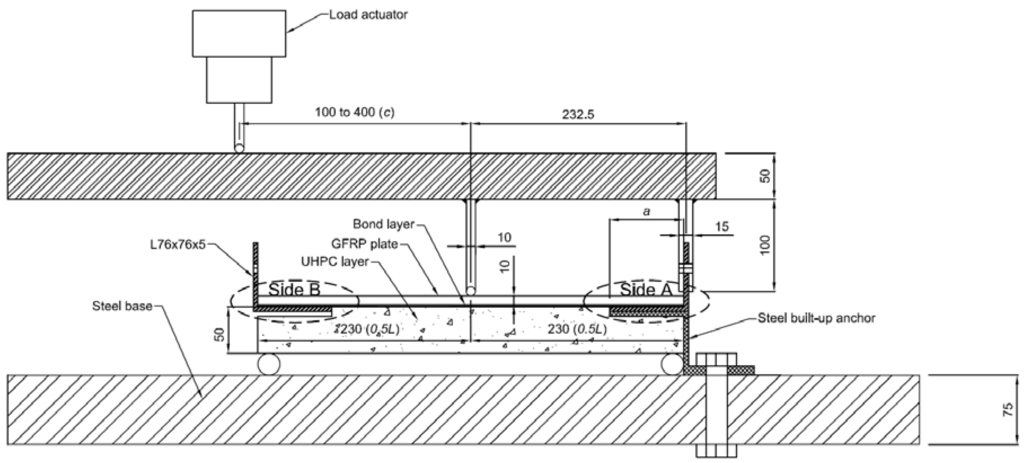The tested specimens consisted of a 9.6 mm thick pultruded GFRP plate bonded to a 50 mm thick cast-in-place layer of UHPC via the epoxy bonded coarse silica sand aggregate layer, with a constant length and width of 460 and 130 mm, respectively, for the entire specimen. The MMB specimens were designed based on the concepts presented in ASTM Standard D6671-06 [11], with modifications made due to the asymmetric and dissimilar bilayer nature of the test cross-section. The cross-section dimensions were also partly determined from previous experimentation [9] on full-scale beam specimens, where it was necessary to maintain an identical height ratio between the GFRP and the UHPC layers in order to allow for ease of comparison between the small-scale and full-scale tests. The intended bonding surface of the GFRP plate was first coarsened using a belt sander and a coarsening stone to improve bonding. Coarse silica sand aggregates, with diameters ranging from 4.5 to 9.0 mm, were then bonded to the surface using a 1 mm thick layer of Sikadur® 32 epoxy [12]. The desired initial crack length was obtained by providing bonded coarse silica sand aggregate layer up to a defined boundary on the GFRP plate as well as placing a thin barrier between the GFRP and UHPC during curing in order to prevent contact. Allowing for an epoxy curing timeframe of 7 days, the UHPC was cast directly overtop of the bonded coarse silica sand aggregate layer. At the ends of the specimen, aluminum angles (L76 × 76 × 5) were bonded to the GFRP plate, which will be fully attached to the steel apparatus during testing.