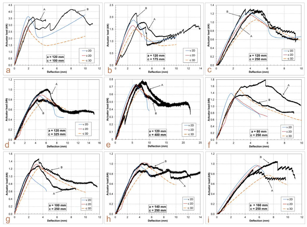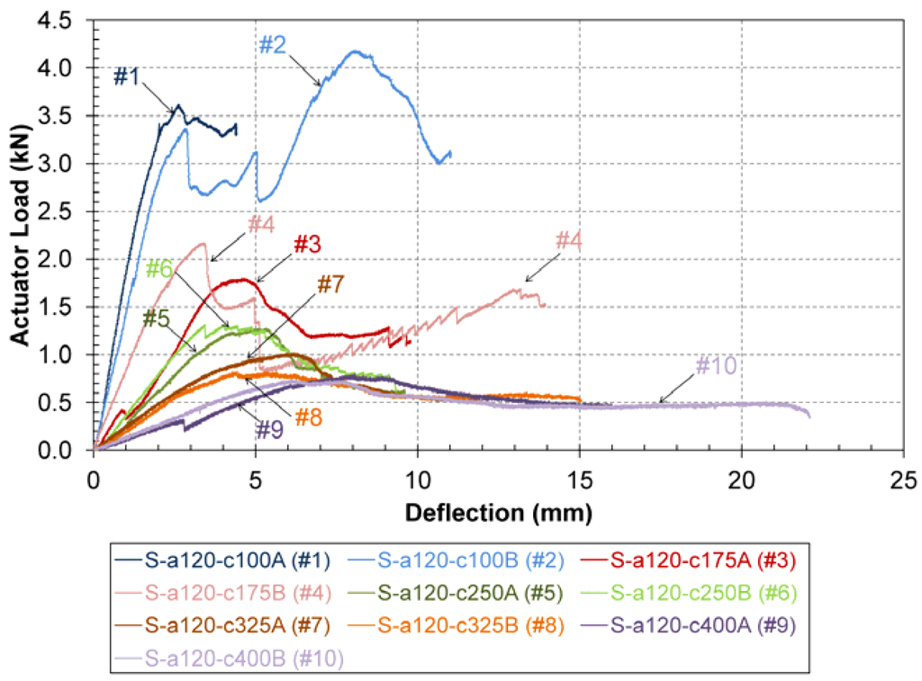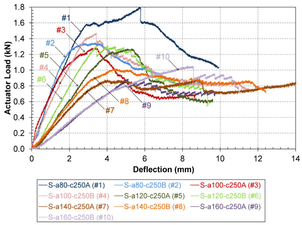 The load-deflection curves, describing the relationship between the applied actuator load and the downward displacement at the point of load application, from the nine tested specimens (with two sets of data obtained for each specimen) are presented in Figure 2 and Figure 3. In order to allow for suitable comparisons, the specimens tested using a moment arm (c) equal to 250 mm are provided in Figure 2, where the specimens tested with a crack length (a) equal to 120 mm are compared with one another in Figure 3.
