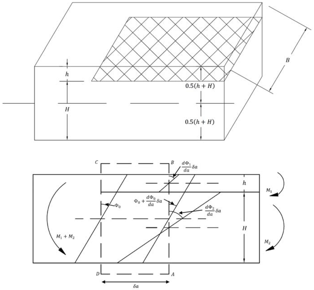 In this following section, an extension to the work originally completed by Williams, derived by the authors, will be presented, resulting in a set of equations for the partitioned critical fracture energy for a MMB asymmetric bilayer specimen with an inhomogeneous cross-section. A diagram illustrating the components of the crack tip contour rotation is provided in Figure 5.