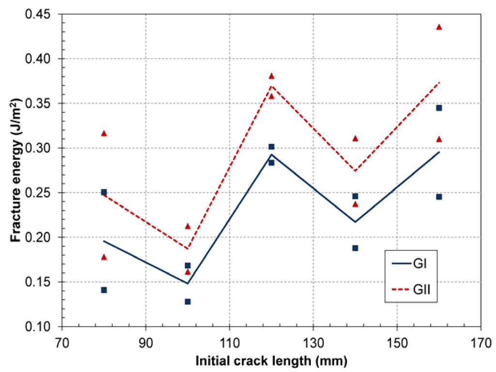 For the determination of the cohesive bond properties, MMB specimens were chosen. The advantage of testing a single series of MMB specimens compared with parallel tests of double cantilever beams (DCB) and end-notch flexure (ENF) specimens is the intermixed nature of the Mode I and Mode II behaviors, allowing for interactions between the cohesive laws governing each failure mode [10]. It also allows for the simultaneous establishment of Mode I and Mode II parameters, though at the expense of more complex analytical calculations.