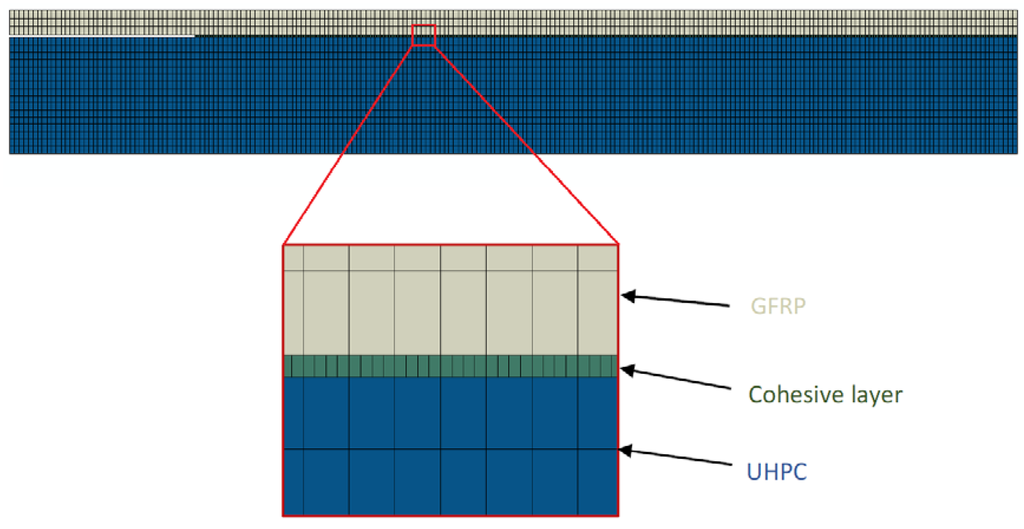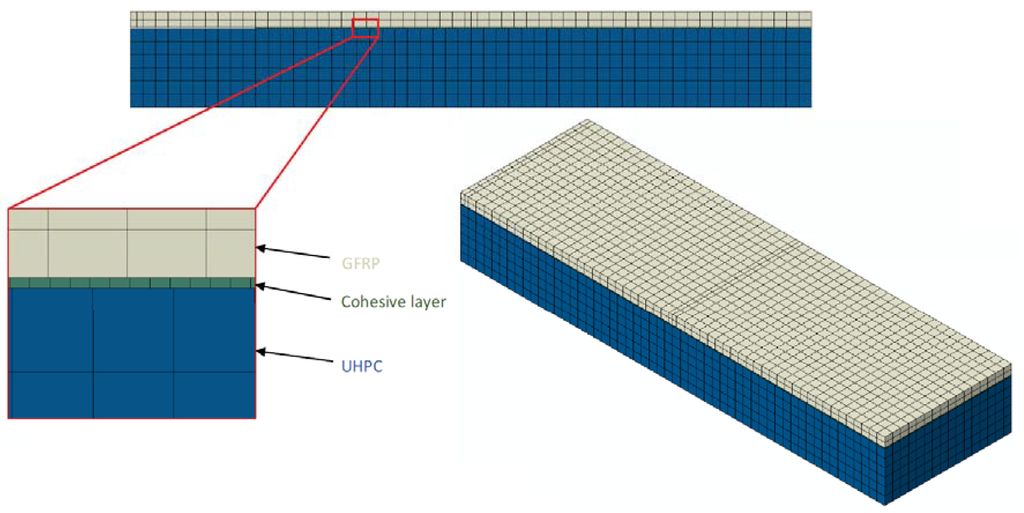The last step was the validation of consistent parameters in a 3D model. Cohesive elements, tied at the top and bottom to the GFRP layer and UHPC layer, respectively, were used in this final stage in order to allow for proper mapping and visualization of the crack propagation. It was assumed for the 3D model that the Mode III parameters were identical to those of Mode II [41]. From a practical viewpoint, the cohesive layer properties in shear (whether in longitudinal or transverse shearing) would be comparable if not identical and it is for this reason that this assumption was made.