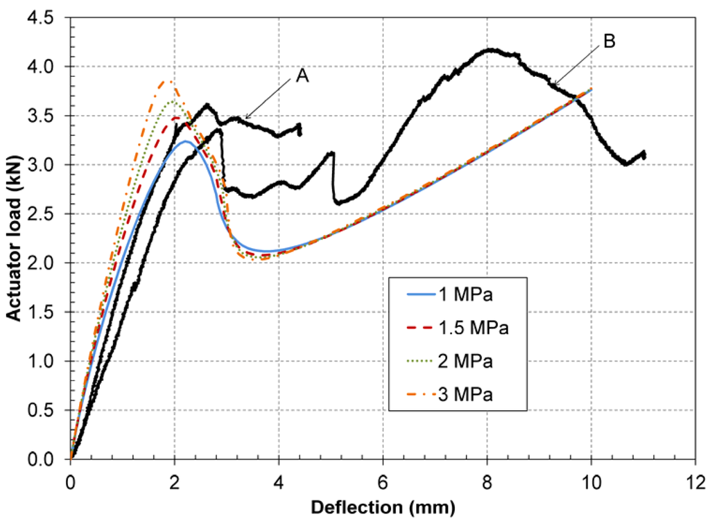 Firstly, the use of a layer of cohesive elements rather than contact interactions to model the bond layer was found to result in decreased stiffness of the interface. This finding is consistent with previous studies performed under pure Mode II loading [38], where the near identical global peak load of the system was reached by both methods, though at a higher displacement in the case where cohesive elements were used. In general, the set of cohesive parameters can be readily applied to both methods of modeling the bond interface, providing a good representation of the system behavior in terms of ultimate capacity. If the physical element-to-element tracking of the crack progression is not a requirement of the investigation being performed, it would be recommended to perform the FEA using contact interactions. On the whole, the FE results demonstrate the flexibility and versatility of the obtained consistent parameters, regardless of the loading and geometric configurations used. The cohesive parameters allowed for good representation of the bond behavior prior to damage with regards to the peak load reached and the expected deflection at the peak point. The idealization of the global post-damage behavior did not exhibit the same degree of accuracy but was adequate at providing the same behavioral trends that were seen in experimentation. Of particular interest are the results obtained from the FE analysis for Specimen S-a120-c100, where the model results also demonstrated an increase in global stiffness and ultimate load reached after crack propagation had initialized. This disproves the initial assumption made in Section 3.4 that the experimental behavior of this one particular test specimen was an abnormality and more investigation should be made to examine the possible influences of the particular test configuration used on the data results.