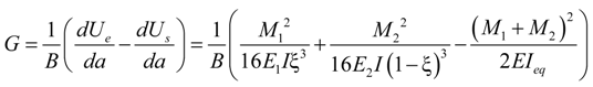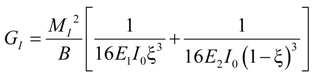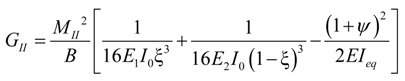 Substituting the expressions for M1 and M2 obtained from Equations (8) to (11) into the expression for the total fracture energy [Equation (7)] and partitioning based on the components relating to MI and MII, we can obtain the equations for the partitioned fracture energy shown below in Equations (12) and (13).