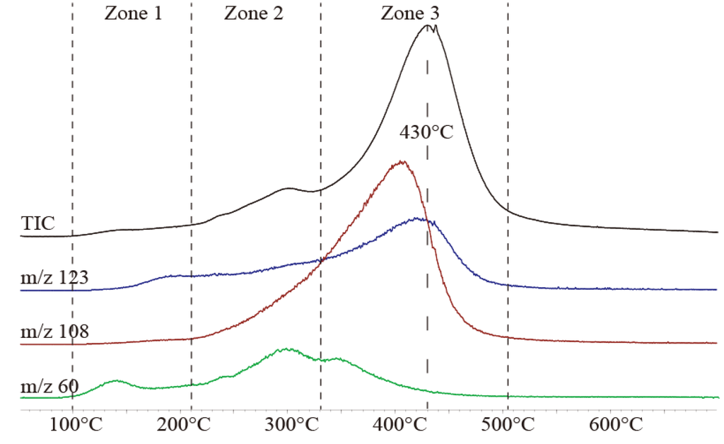 Evolved gas analysis (EGA) is a method used to analyze the gas emitted while the heated sample undergoes decomposition or desorption [11,12,13,14]. The mechanical configuration characteristically uses a short column and evolved gas detection (EGD). As many organic macromolecules are decomposed at less than 1000 °C, a restricted set of temperatures in the range of 50–1000 °C is used. In the research on lacquer films, the temperature range is always set at 50–650 °C, and the gas chromatograph oven was programmed to provide a constant temperature increase of 10 °C per min, from 50 to 650 °C. EGA analysis decomposes a lacquer film in three steps: low (100–200 °C), medium (200–300 °C), and high (300–500 °C) temperature from our results as shown in Figure 2. The first peak of m/z = 60 at the low temperature (100–200 °C) was short carboxylic acid with various carbon chains. The second peak at the medium (200–300 °C) was considered to be due to the decomposition of sugars. The other two peaks of m/z = 108 and m/z = 123 appeared at high temperature (300–500 °C) were considered to be the original thermal decomposition peak of urushiol. Acetone powder, which is the acetone insoluble material during extracted urushiol with acetone, also was analyzed by EGA, and the peak position of acetone powder was mostly in agreement with the second EGA peak, that is, there are many sugars contain in the acetone powder.