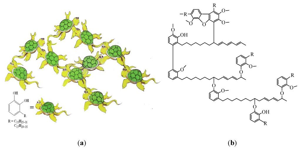 Image (a) and chemical structure (b) of lacquer polymerization.