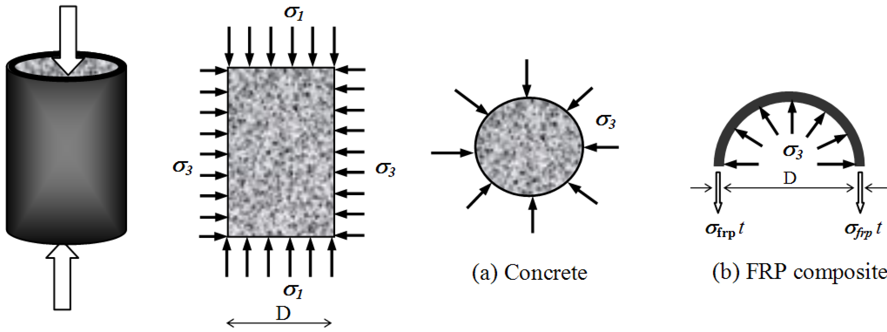 In FRP confined columns, the fibers are generally aligned primarily along the hoop direction to provide the confinement of concrete while the fibers in the axial direction provide the flexural strength and stiffness. While the concrete is stressed triaxially, the FRP jacket is loaded uniaxially and, at the FRP-concrete interface, the confining radial pressure σ3 (Figure 2) develops by:
