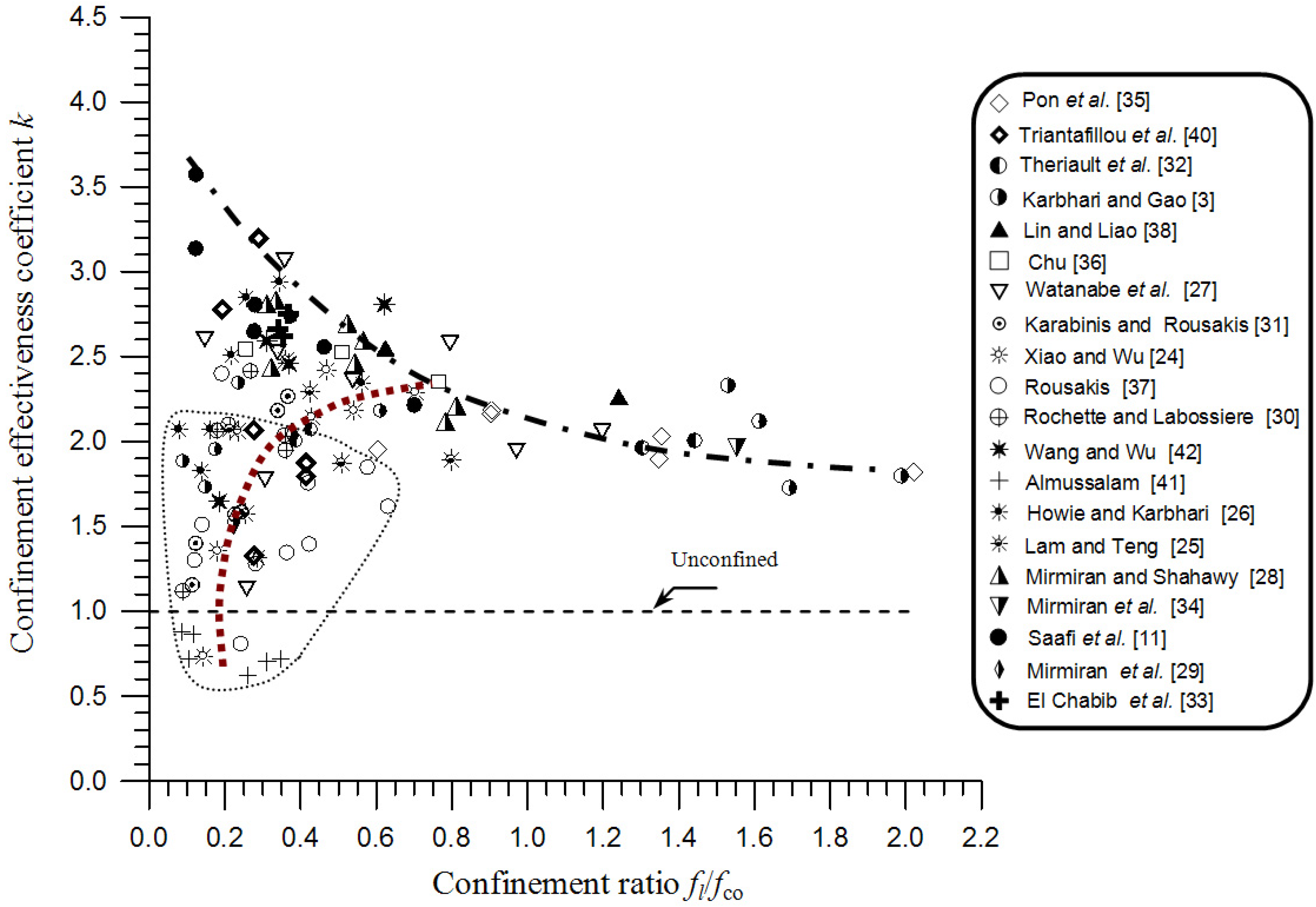 Saatcioglu and Razvi [47] found that the coefficient k decreases with increasing confining pressure by approaching a constant value in high lateral stresses. While Candappa et al. [50] proposed k = 5.3 for low confinement levels, Ansari and Li [10] found k = 2.6 for high confinement levels. Dahl [51] has shown that the traditional value of k = 4.1 overestimates the ultimate strength for the confinement ratios exceeding 0.5. For FRP-confined concrete, while some authors suggested a constant value for k [6,14,22,52,53,54], according to other authors, k should be a function decreasing with the confinement ratio [3,11,12,13,20,55].