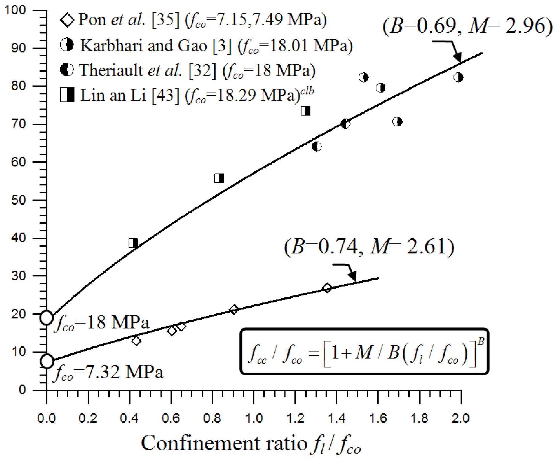 Thus, by knowing B and M coefficients, the failure envelope can be established easily. For the strength levels lower than about fco = 25 MPa, M values decreases from 3.8 down to about 2.6 (fco = 7.3 MPa). From 25 MPa to upper strength levels, M values gradually decrease, e.g., M coefficient is 0.75 for fco = 108 MPa.