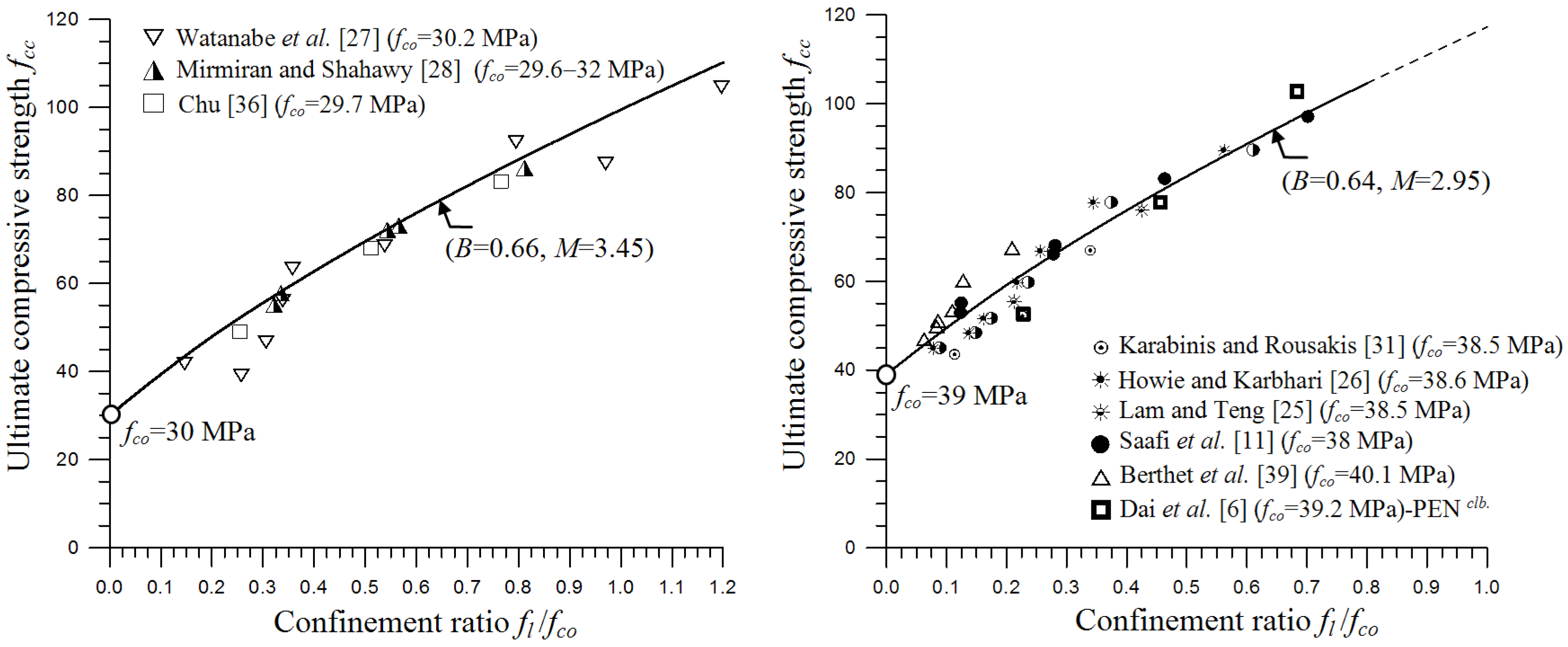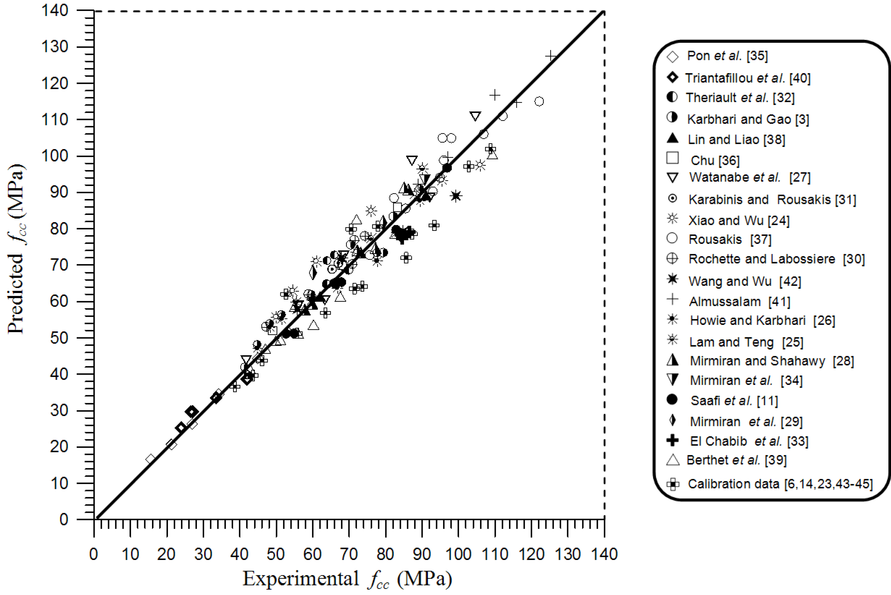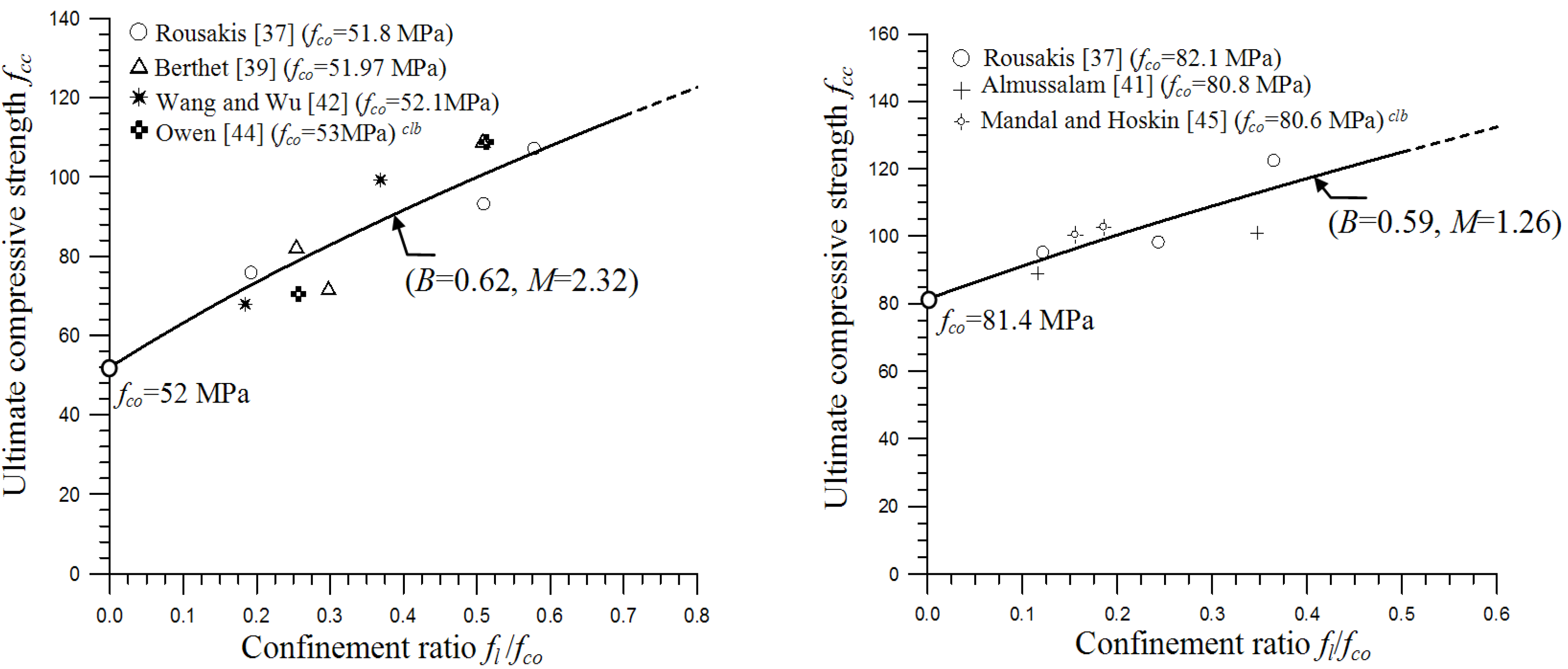 | Rousakis [20] (fco = 9–170 MPa) | ![]() | 10.2 c (−7.8, +10.8) | 11.4 (−15.1, +8.5) | 5.1 (−6.3, +4.1) | 6.7 (−5.6, +6.1) | 6.4 (−6.3) | 7.5 (−7.8, +7,8) |