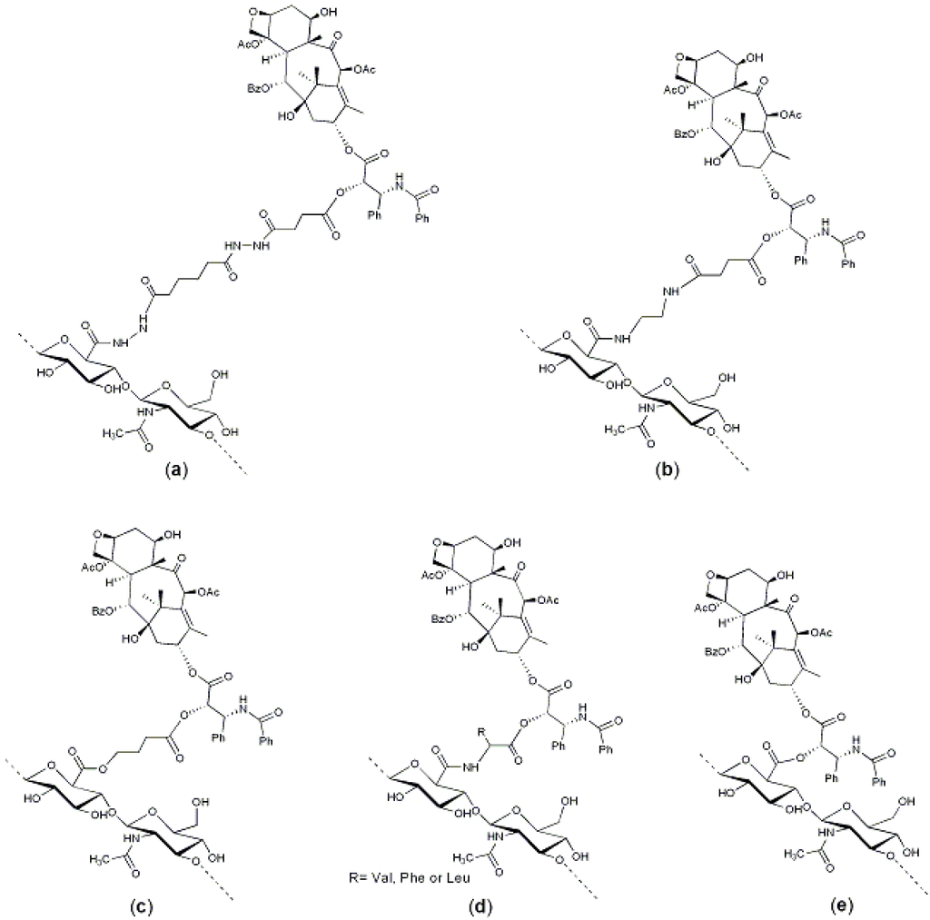 HA–paclitaxel conjugates: (a) A hemisuccinate NHS activated ester of paclitaxel was linked to an HA-ADH derivative [29]; (b) A hemisuccinate NHS activated ester of paclitaxel was linked to an HA–EDA derivative [36]; (c) A 2′-paclitaxel-4-bromobutyrate was conjugate to HA [37]; (d) An amino acid-paclitaxel derivative was linked to HA activated by carbodiimide [44]; and (e) Paclitaxel was directly conjugated to carboxylic groups of HA by means of dicyclohexylcarbodiimide (DCC)/dimethylaminopyridine (DMAP), leading to polymeric micelles [45].