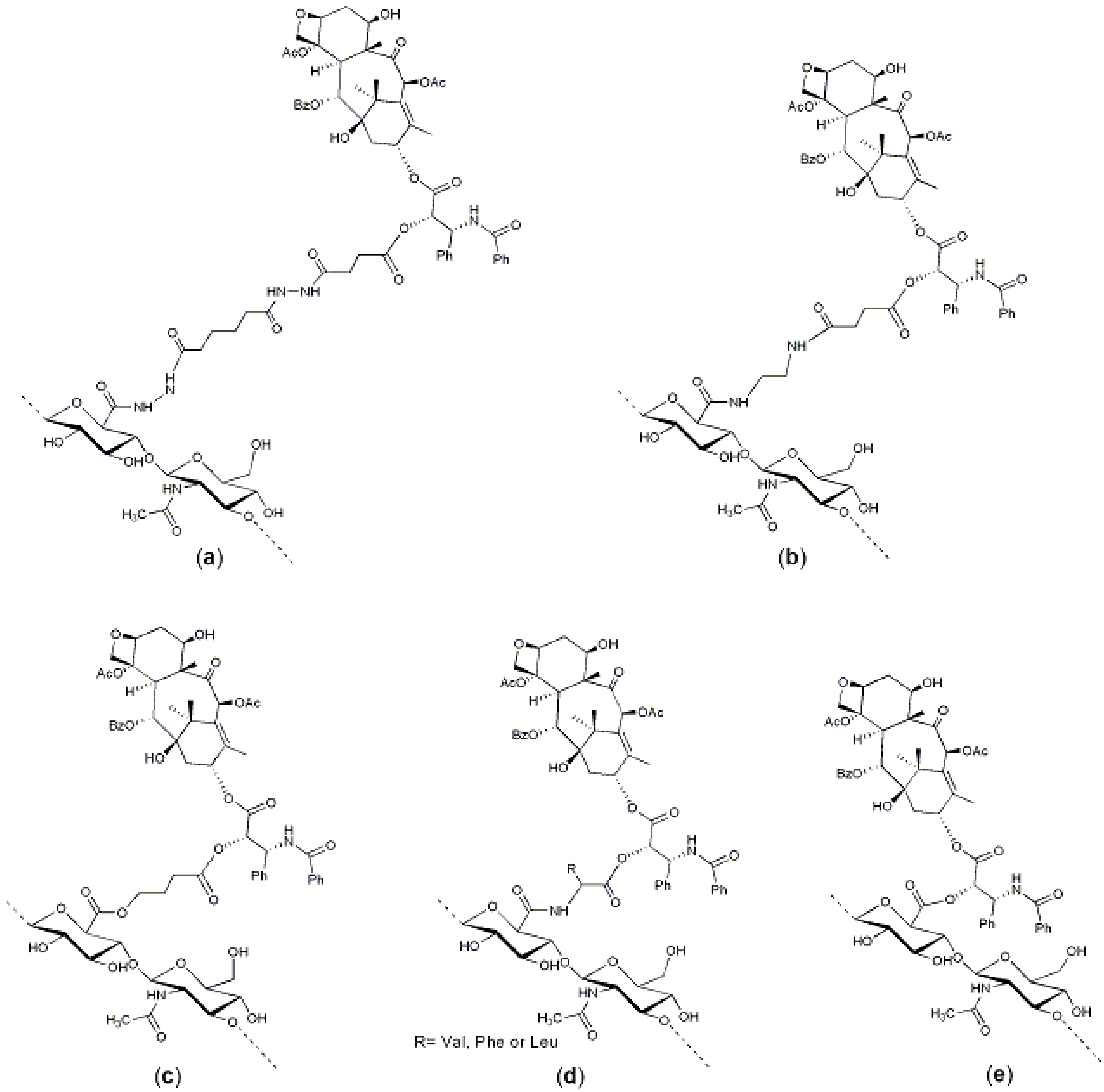 - Leonelli, F.; La Bella, A.; Francescangeli, A.; Joudioux, R.; Capodilupo, A.; Quagliariello, M.; Migneco, L.M.; Bettolo, R.M.; Crescenzi, V.; de Luca, G. A new and simply available class of hydrosoluble bioconjugates by coupling paclitaxel to hyaluronic acid through a 4-hydroxybutanoic acid derived linker. Helv. Chim. Acta 2005, 88, 154–159. [Google Scholar] [CrossRef]