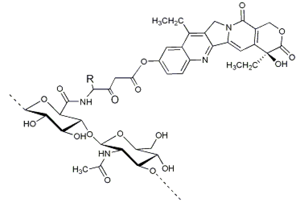 Crescenzi and co-workers in collaboration with Fidia Farmaceutici suggested another approach to conjugate paclitaxel to HA (200 KDa): firstly, the hydroxyl group of paclitaxel was esterified with 4-bromobutyric acid, previously activated via a carbodiimide, and then, the 4-bromobutyric-paclitaxel was linked to HA by forming an ester bond with the carboxylic group of HA in an organic solvent [31,37]. Therefore, the spacer was linked to both paclitaxel and HA via ester bonds (Figure 3c). The conjugate (ONCOFID™-P) achieved a remarkably high drug loading (up to 12 mol %) and solubility (up to 15 mg/mL conjugate equivalent). Rosato et al. reported that ONCOFID™-P easily released paclitaxel after cell internalization and presented a stronger antitumor activity than the free drug [38]. De Stefano et al. reported the safety and tolerability of ONCOFID™-P after loco-regional treatment of ovarian cancer xenograft in mice, it being capable of providing higher dosages without increasing adverse effects [39]. Currently, ONCOFID™-P is undergoing phase II clinical studies in six European countries for the treatment of refractory bladder cancer [38,40]. The same conjugation strategy of ONCOFID™-P was successfully applied to other antineoplastic agents, presently under development by Fidia Farmaceutici [41], such as docetaxel, doxorubicin and the active metabolite of irinotecan (7-ethyl-10-hydroxycamptothecin), leading to the ONCOFID™ platform. ONCOFID™-S (Figure 4), for example, was synthesized by coupling 7-ethyl-10-hydroxycamptothecin (SN38) to HA. The conjugate demonstrated the ability to block the cellular proliferation by a mechanism different from the apoptotic action of the reference drug, this making the HA derivative a drug with a new therapeutic activity and a higher efficacy [40,42]. ONCOFID™-S has been developed for the loco-regional intraperitoneal treatment of peritoneal carcinomatosis; the in vivo study demonstrated that once administered intraperitoneally in rats, it was poorly absorbed into the systemic circulation, even after the administration of a high dose [43].
