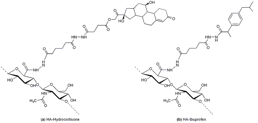 (a) HA-hydrocortisone: the HA-ADH derivative was conjugated to a hemisuccinate derivative of hydrocortisone previously activated with NHS [55]; and (b) HA-ibuprofen: the HA-ADH derivative was conjugated to an activated ester of ibuprofen, using a carbodiimide and NHS [55].
