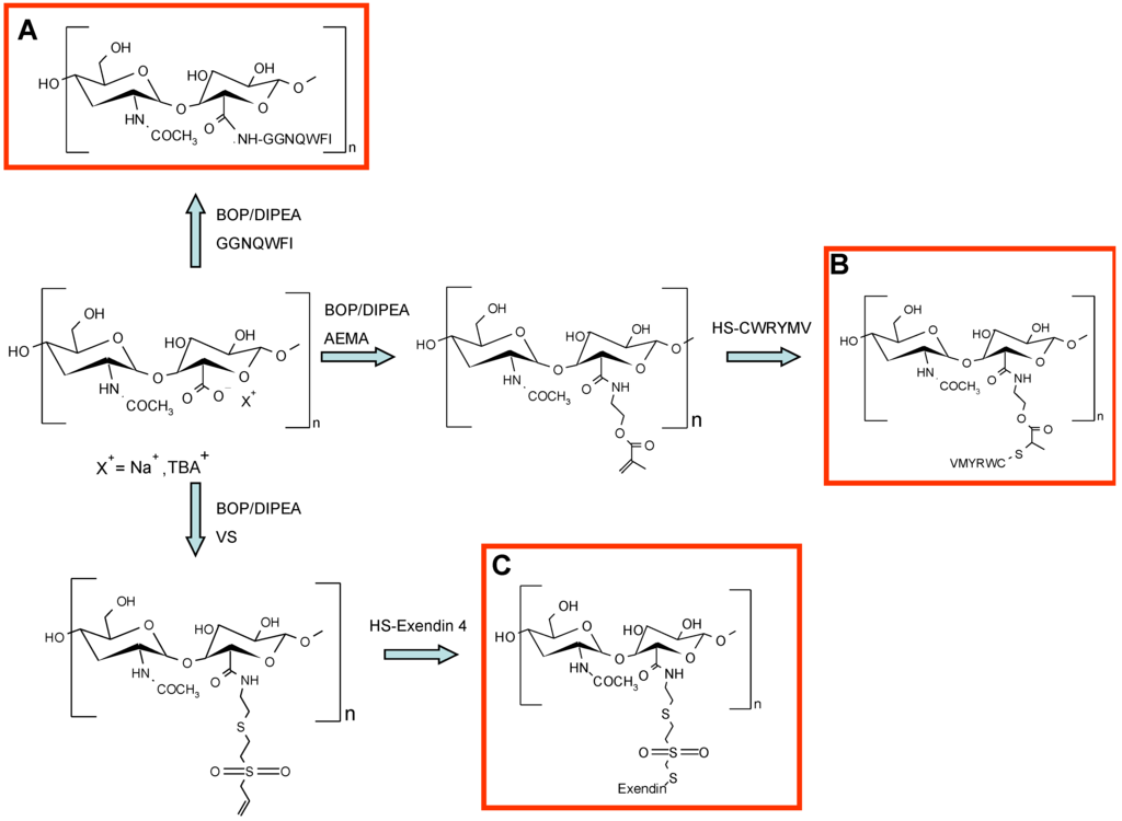 Schematic representation of different HA activation and peptide conjugation. (A) Chemical conjugation of anti-Flt1 peptide to HA in anhydrous dimethylsulfoxide (DMSO) using BOP and diisopropylethylamine (DIPEA) as a coupling reagents [66]; (B) Conjugation of aminoethyl methacrylated HA (HA–AEMA) with CWRYMV peptide via Michael addition between the methacryloyl group of AEMA and the thiol group of cysteine in the peptide [72]; and (C) Conjugation of HA to exendin-4 by a Michael addition involving a HA–vinyl sulfone (VS) derivative and a thiolated peptide [69].