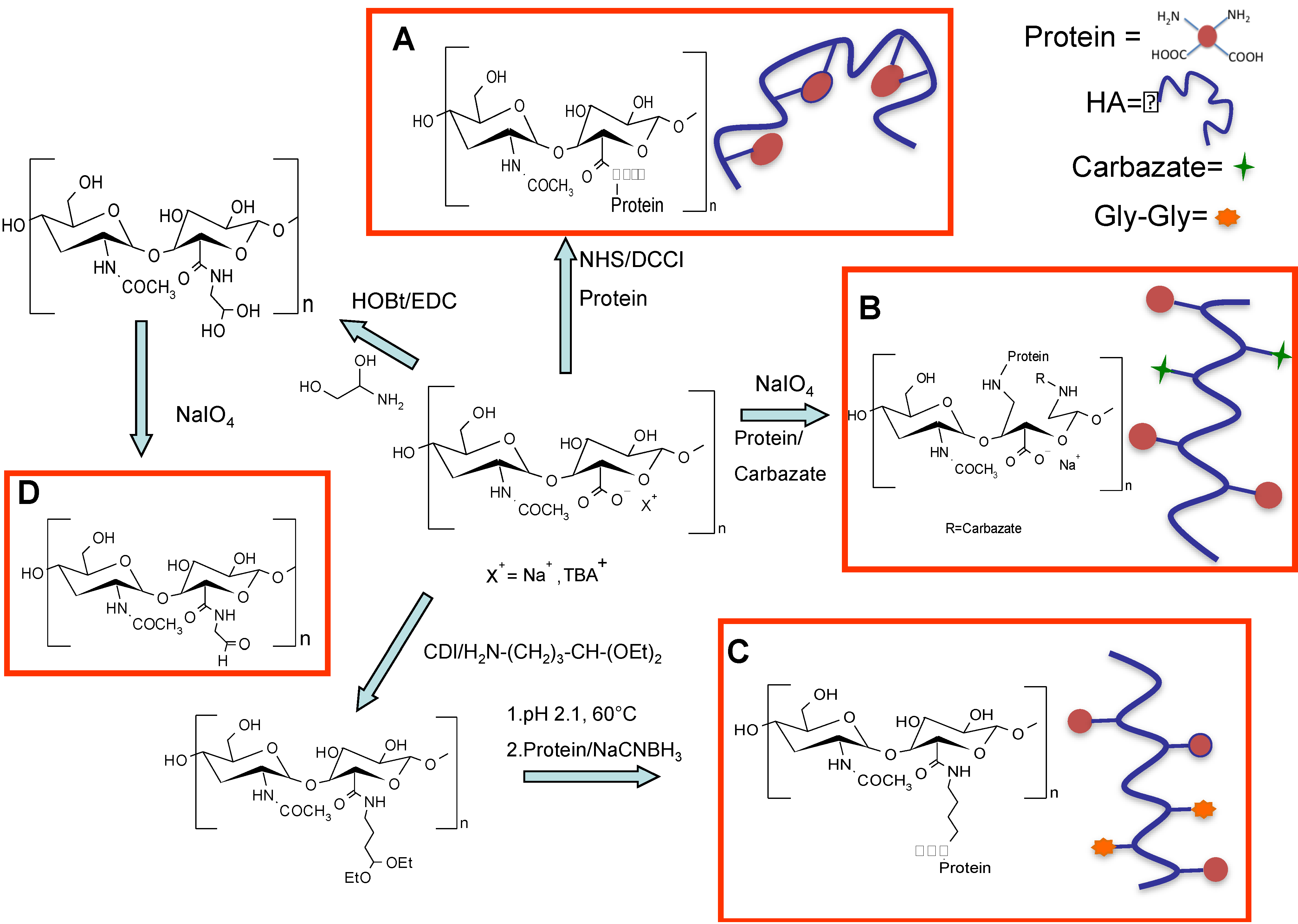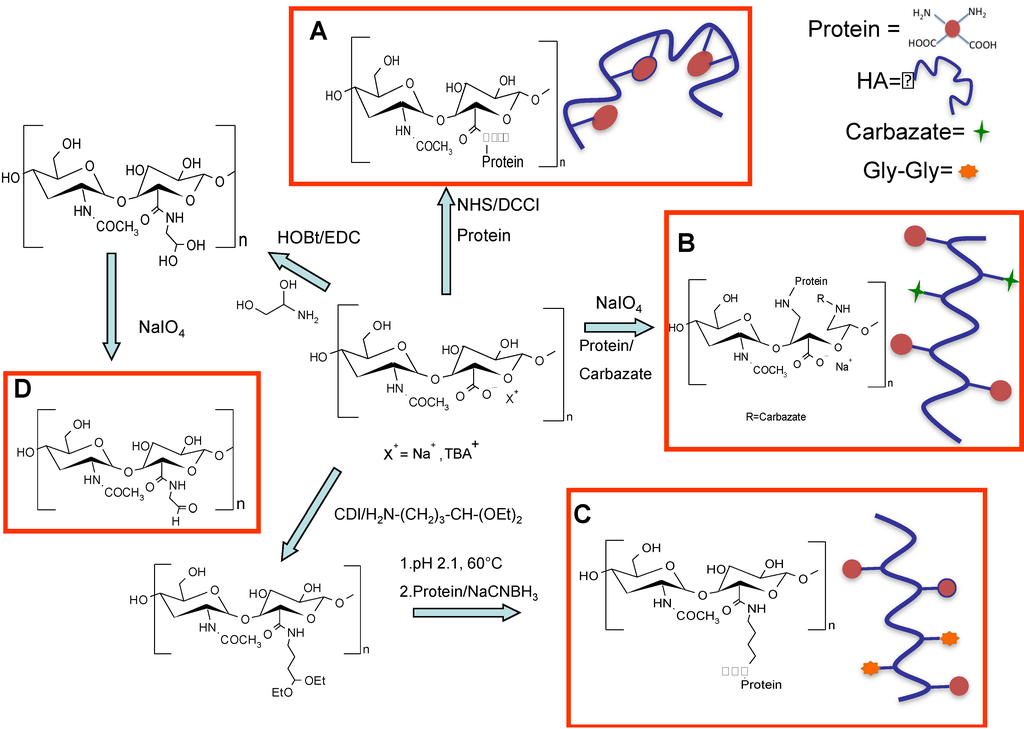 Schematic representation of different HA activation methods and the following conjugation to proteins: (A) random conjugation of amino groups of proteins to carboxylic groups of HA [24]; (B) Slight HA oxidation in the presence of periodate and conjugation of HA–ALD with N-terminal primary amine group of proteins [78,79]; (C) Modification of HA with an acetal spacer for selective conjugation to the N-terminal amino groups after hydrolysis to the active aldehyde of the polymer [65]; and (D) Coupling of amino glycerol to HA carboxylic groups and partial oxidation for selective N-terminal conjugation to proteins [82].