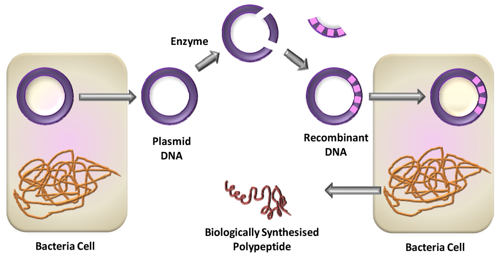 In recombinant techniques (genetically encoded synthesis) three steps can be described. First of all, the creation of a recombinant gene segment that encodes for the protein of interest: a protein target is identified and translated into the corresponding genetic code. Then, the target oligonucleotide is synthesised; secondly, the insertion of this segment into a DNA vector, which is classically a plasmid from bacteria to produce a recombinant DNA molecule; and finally, transformation of this recombinant DNA molecule into a host cell. Cells that are successfully transformed with the recombinant DNA molecule are grown in culture. This gene produces large amounts of the desired protein, which is later isolated from the cells (Figure 2). Due to low cost and convenience, bacteria [such as Escherichia coli (E. coli) or Bacillus subtilis] are the most frequently used. It is important to mention that the achievement of the recombinant gene is the rate-limiting step, in particular if the polypeptidic product of interest is based on a large number of repeats.