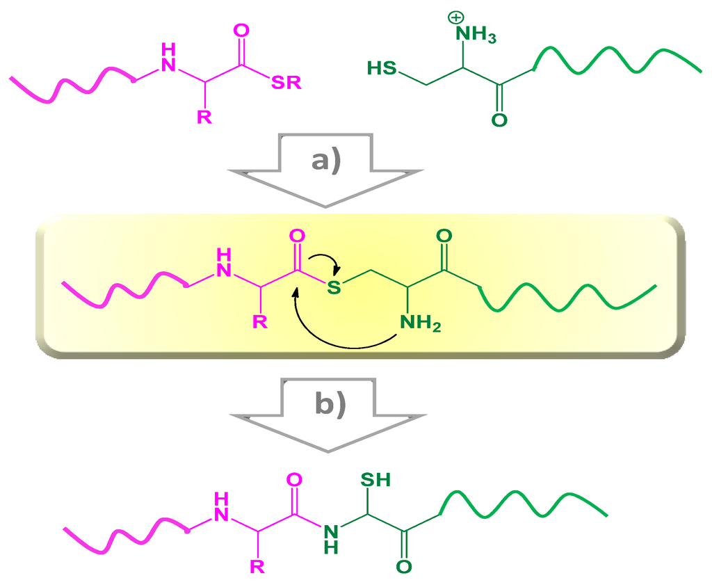Native chemical ligation. (a) water, pH = 7; (b) rearrangement of thioester intermediate amide linked product.