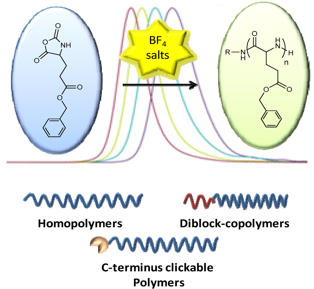 The recently reported use of primary amine tetrafluoroborate (BF4) salts by Conejos-Sanchez et al. [51,82] as an improvement of the Schlaad method represents a powerful alternative to the above-described methodologies, since the non-nucleophilicity of the BF4 salts in contrast to the Cl counteranions cannot lead to initiation steps (Figure 5). This newly reported strategy allows a multigram scale [83] polyglutamate synthesis with defined molecular weight (up to 800 units), low polydispersity (<1.2), controlled chain end functionality and adequate stereoselectivity and absence of any trace of toxic impurity to allow biomedical applications. Conformation and polydispersity are relevant parameters in the named methodology. Recently, Huesmann et al. have addressed both topics in polylysine synthesis [84].