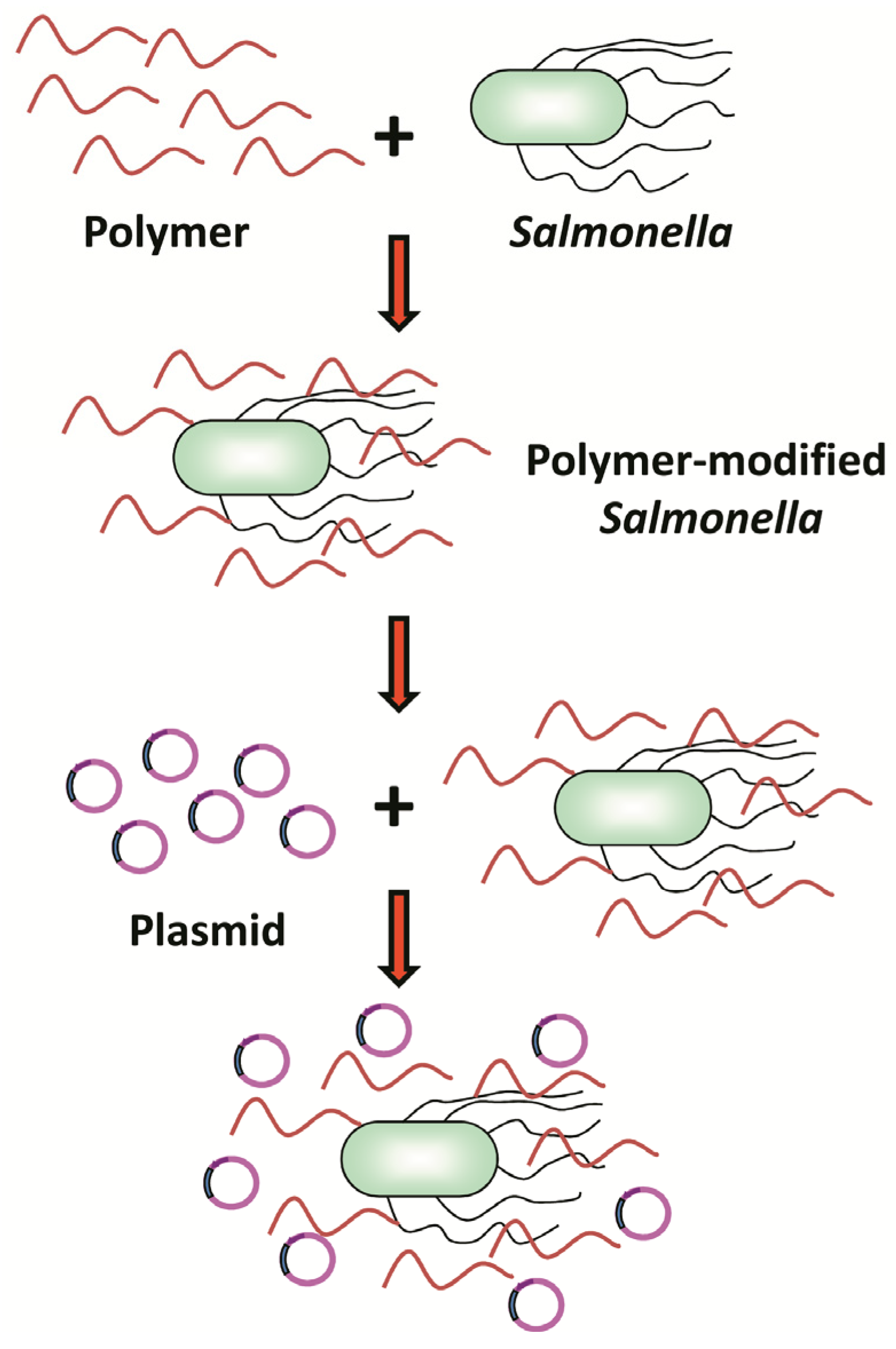 Herein, the encapsulation of Salmonella in polymer increases the gene transfer ability of Salmonella following in vivo delivery. The polymer-modified Salmonella delivered a gene to tumor sites and replicated in tumor sites, which are believed to stimulate non-specific antitumor immunity. These results help define the obstacles that it is necessary to overcome in order to deliver successful bacterial gene therapy.