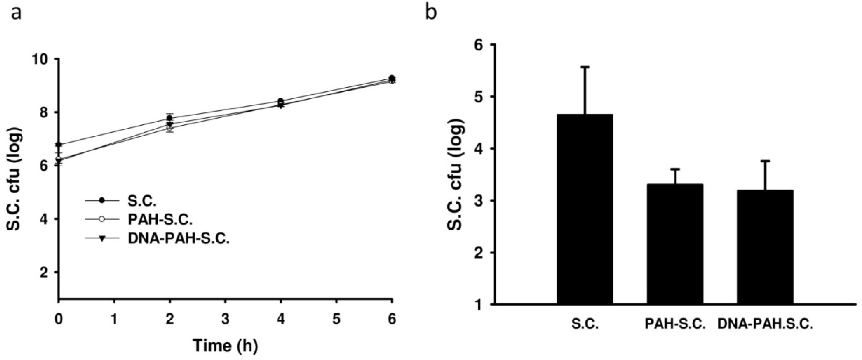 Replication and invasion activity of DNA-PAH-Salmonella (S.C.). (a) DNA-PAH-S.C. replication. The number of DNA-PAH-S.C. cells was determined 6 h post-incubation; and (b) The 4T1 cells were infected with 106 cfu of DNA-PAH-S.C., PAH-S.C., or S.C. cells. A gentamicin protection assay was used to examine these cells 9.5 h later. The data are reported as the means ± SD (n = 3).