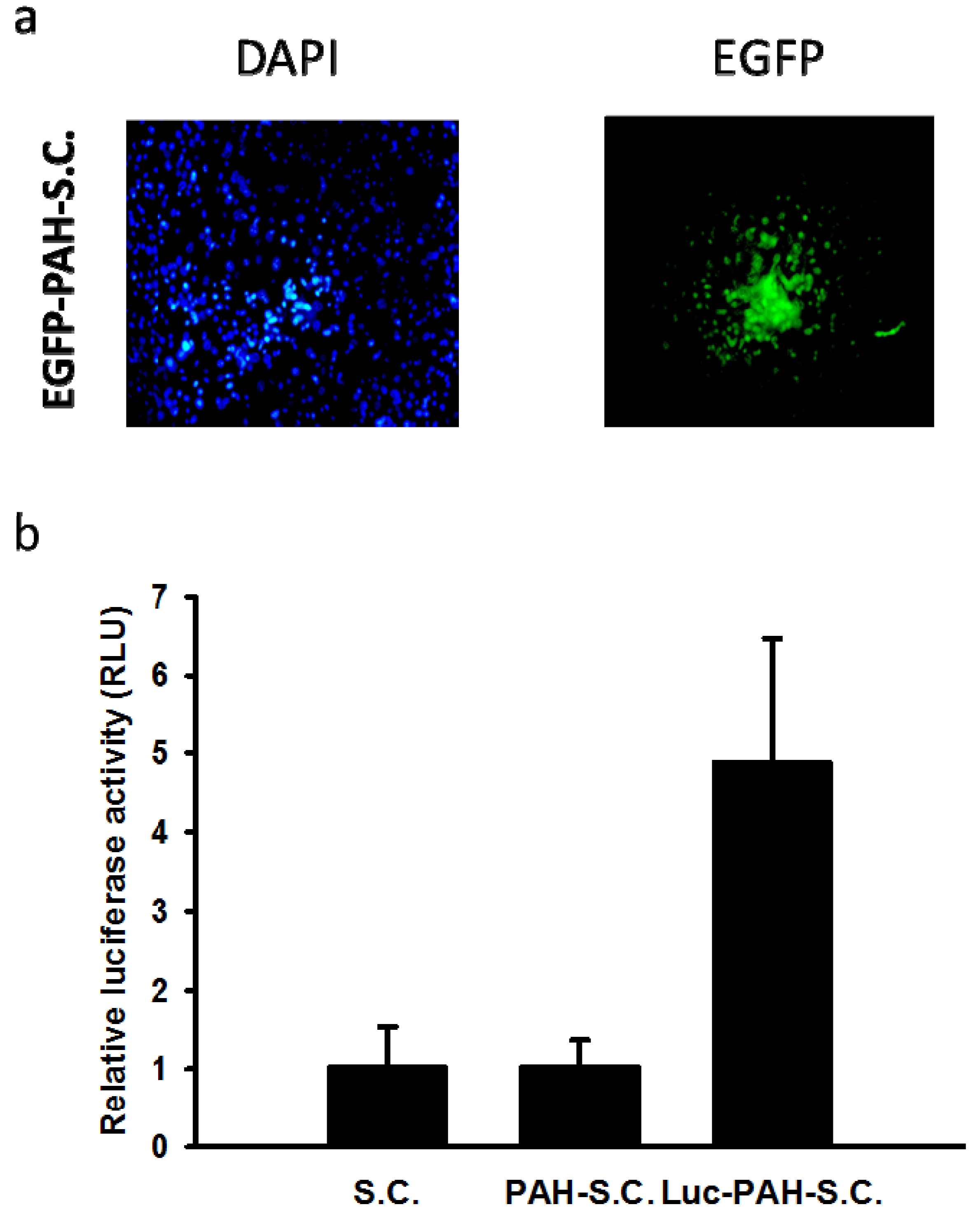 Transduction ability of DNA-PAH-S.C. (a) Cells transduced by Salmonella (S.C.) and coated with PAH and EGFP. EGFP was imaged using fluorescence microscopy, and cell nuclei were counterstained with 4′,6-diamidino-2-phenylindole (DAPI); and (b) The effect of DNA-PAH-S.C. on gene transfer in vitro. 4T1 cells were infected with S.C. (106 cfu), PAH-S.C. (106 cfu), or Luc-PAH-S.C. (106 cfu). Luciferase activities in these cells were measured 16 h later.