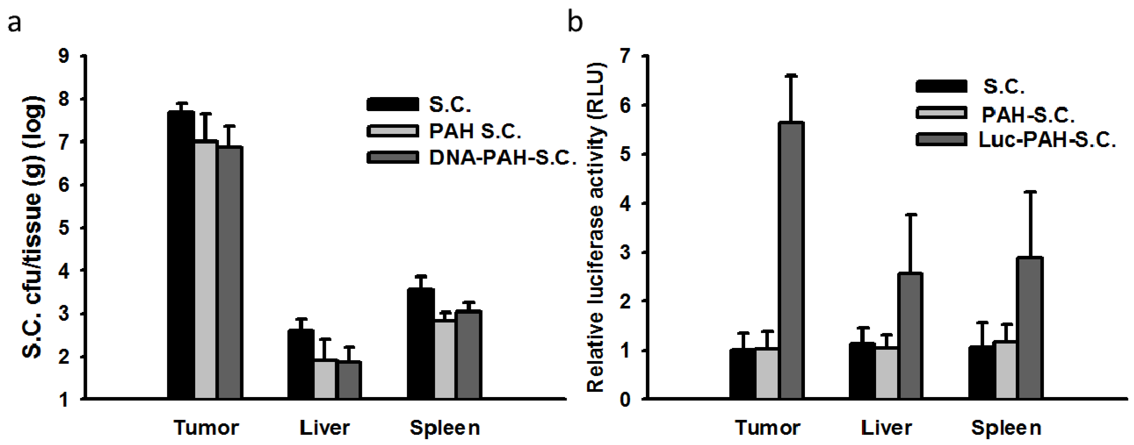 To investigate the tissue distribution of DNA-PAH-S.C., tumor-bearing mice were i.v. injected with various modified S.C., and the amounts of Salmonella in the tumors, livers, and spleens were determined at day 10. As shown in Figure 4a, systemically administered S.C., PAH-S.C., or DNA-PAH-S.C. preferentially accumulated within the tumors at tumor-to-normal tissue accumulation ratios of 1000–10,000:1. Notably, the DNA-PAH-S.C. restored the tumor-targeting ability of Salmonella in mice. As shown in Figure 4a, 10 days after DNA-PAH-S.C. inoculation, the amounts of Salmonella in the tumors were approximately 4 orders of magnitude higher than those found in the spleen and liver. In addition, luciferase expression was readily observed at the tumor sites after Luc-PAH-S.C. inoculation (Figure 4b). Previously, we found that Salmonella PAH coating was diluted with each subsequent cell division, and the level of polymer coating continuously decreased during bacterial division. Our data support the hypothesis that the large size of DNA-PAH-S.C. retained the ability to infect tumor cells in vitro and in vivo (Figure 2, Figure 3 and Figure 4). The DNA-PAH-S.C. displayed tumor-targeting efficiency and gene transfer ability in vivo.