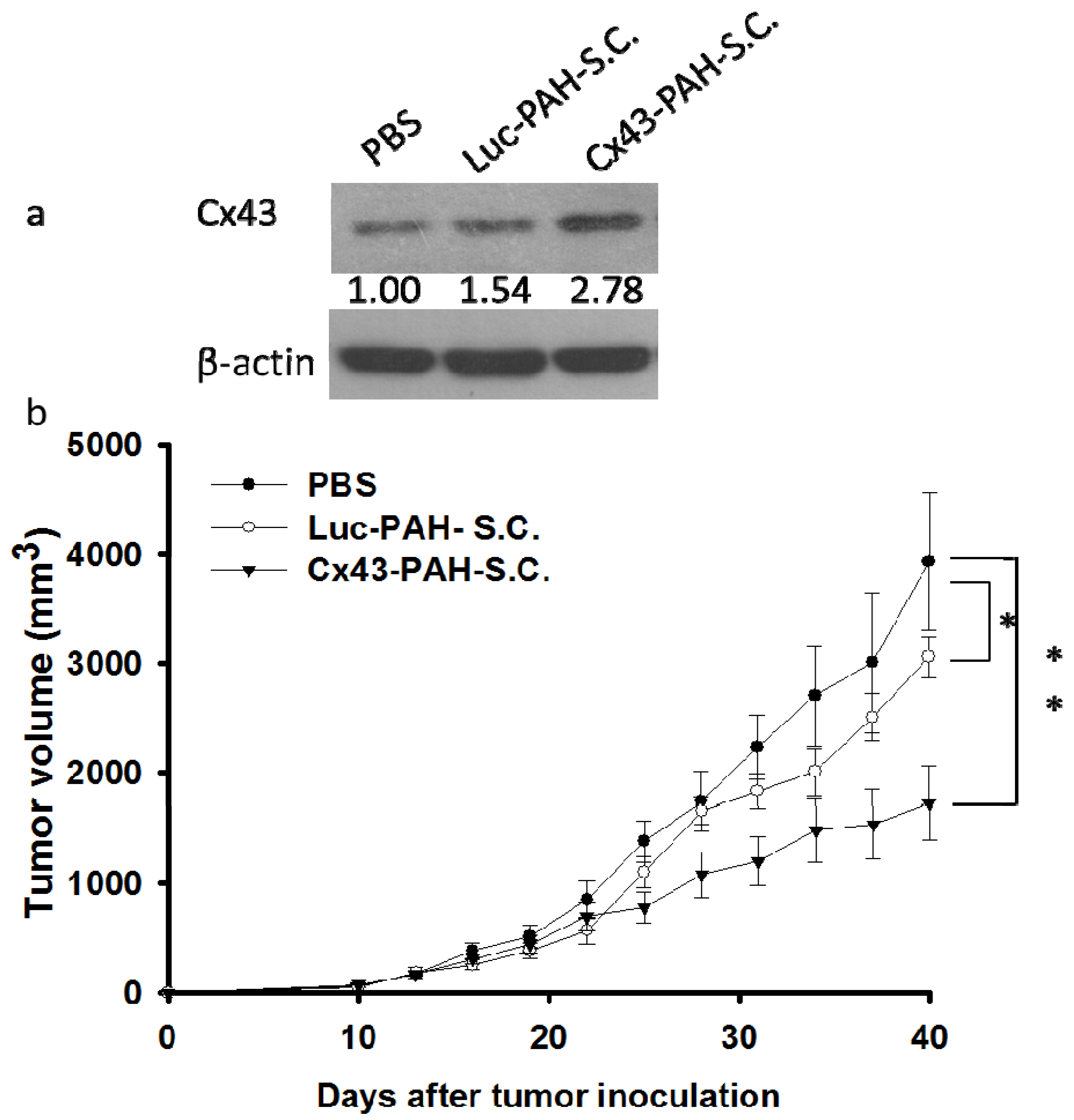 The antitumor effects of Cx43-PAH-S.C. on mice. Mice bearing 4T1 tumors were injected i.v. with PAH-S.C. (2 × 106 cfu) or Cx43-PAH-S.C. (2 × 106 cfu) on day 7. The vehicle control mice received PBS. (a) Cx43-PAH-S.C. induced Cx43 protein expression in tumors in vivo. 4T1-established tumors were treated with PBS, PAH-S.C., or Cx43-PAH-S.C. Three days later, the mice were killed, the tumors were collected, and the tumor lysates were analyzed for Cx43 expression using immunoblot analysis; and (b) Tumor volumes (mean ± SEM, n = 8) from mice bearing 4T1 tumors were compared among the different treatment groups. * p < 0.05; ** p < 0.01.