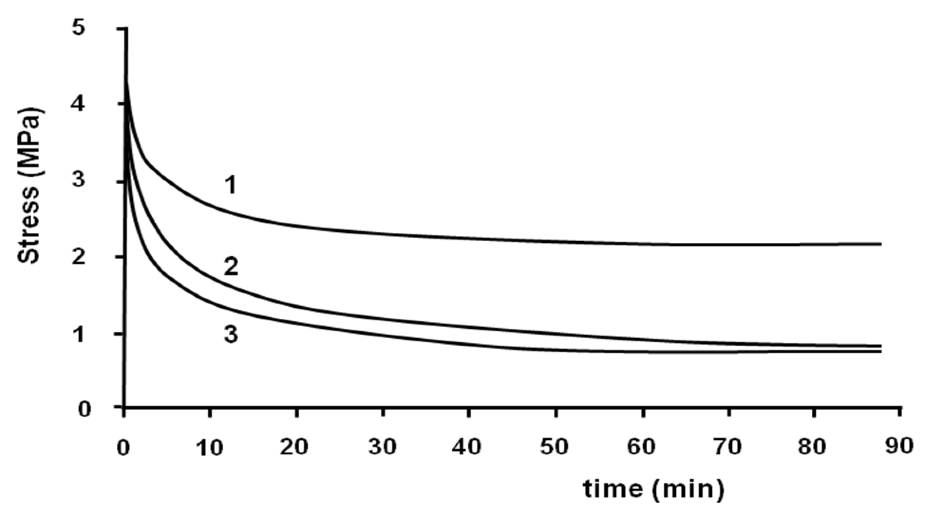 (ii) Stress-Relaxation test: This test was performed at the end of the tensile test with the same machine. The strain was taken as constant (100%, 200% and 250%) and the decrease of stress was measured versus time. This test was performed to eliminate the residual stress induced during the tensile test in the samples. The stress-relaxation tests were performed at 70, 75 and 80 °C.