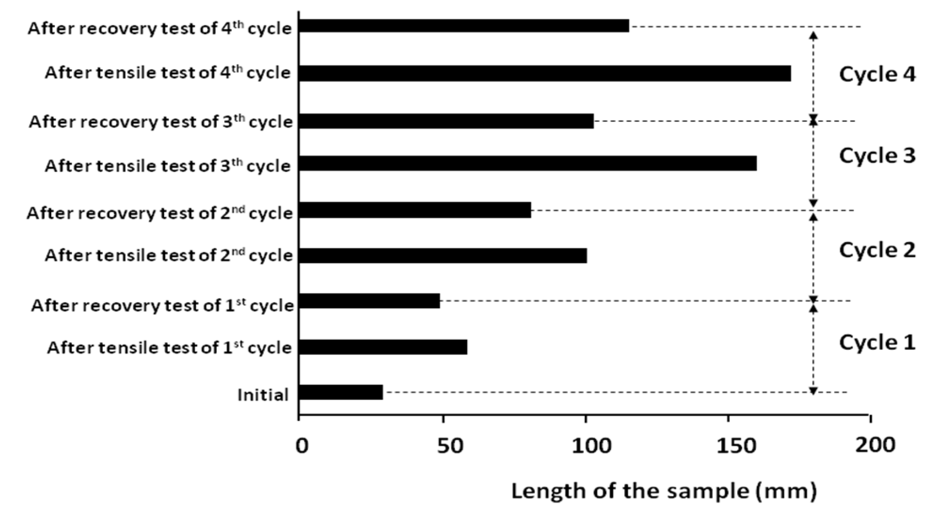 26], we showed that after recovery a SMP does not necessarily exhibit the same properties; that means even after regaining 100% of initial shape, the polymer may not always show the same properties. In the case of thermal stimuli sensible polymers, one of the ways to determine this relationship is to perform cyclic-thermo-mechanical tests. This investigation can be carried out by means of a tensile machine equipped with a thermo chamber.