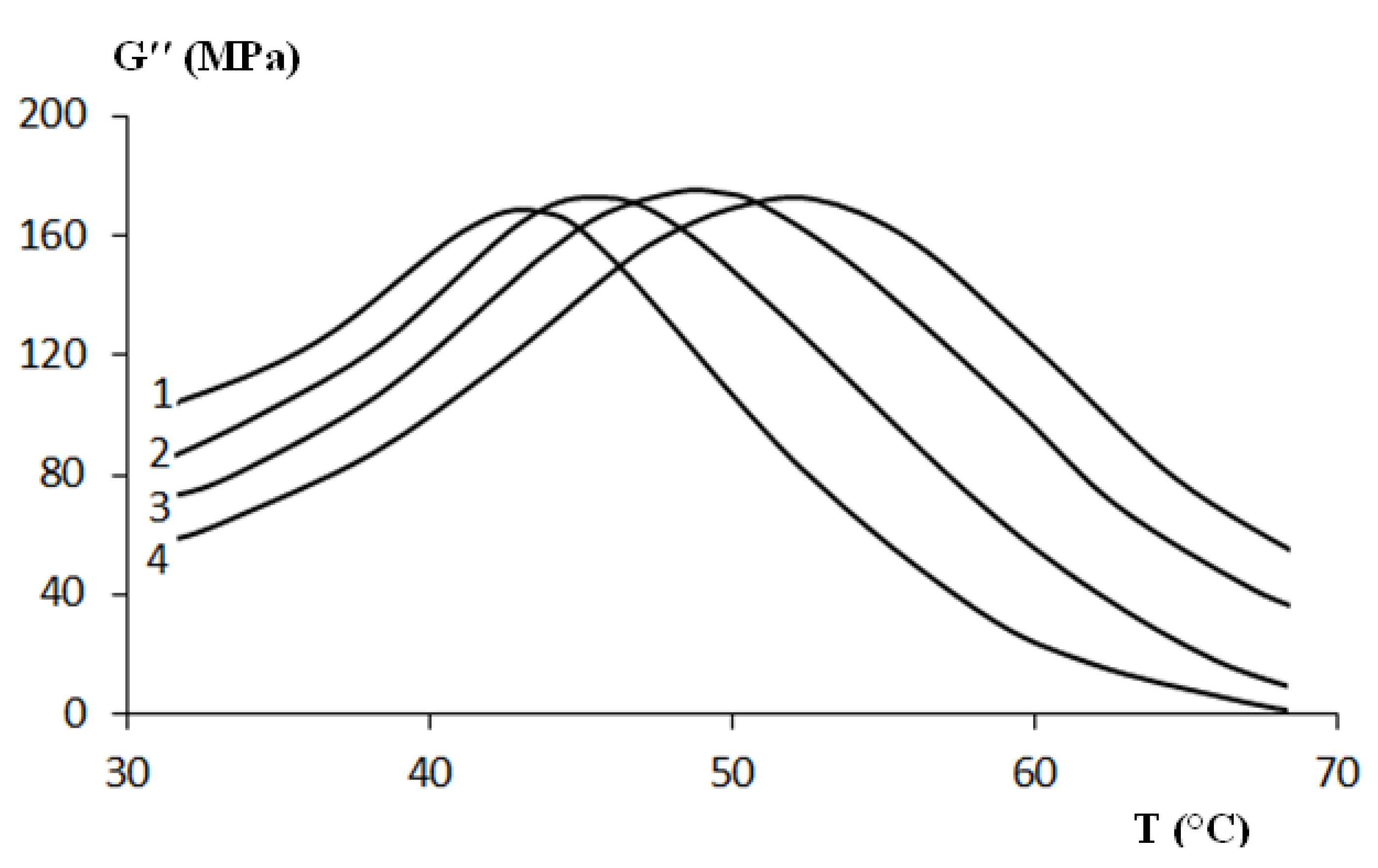 Multi-frequency 3 point bending dynamic mechanical analyzer (DMA) test on virgin polyurethane (PU): (1) 0.1 Hz; (2) 1 Hz; (3) 10 Hz; and (4) 100 Hz.