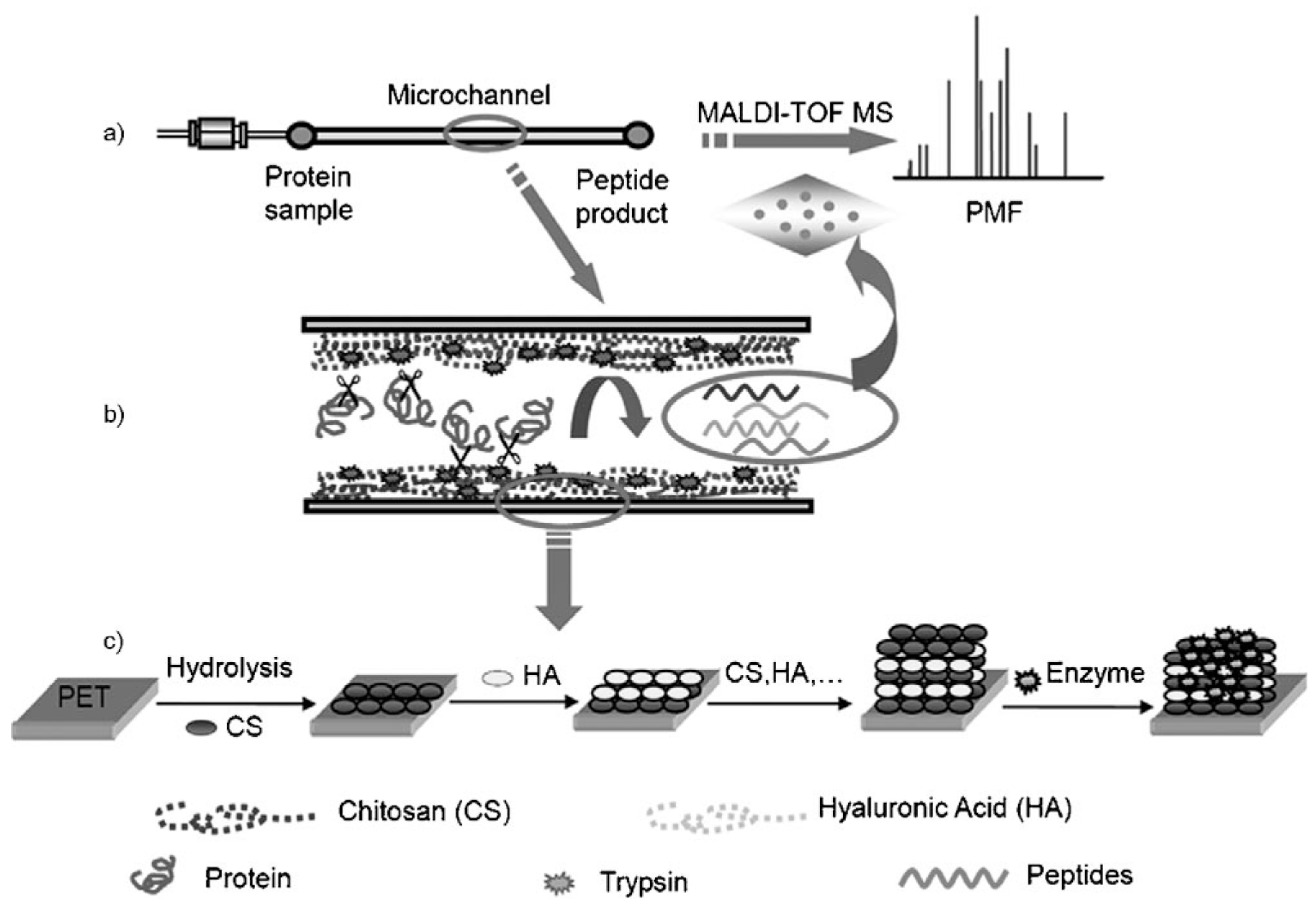 - Liu, Y.; Zhong, W.; Meng, S.; Kong, J.; Lu, H.; Yang, P.; Girault, H.H.; Liu, B. Assembly-controlled biocompatible interface on a microchip: Strategy to highly efficient proteolysis. Chem. Eur. J. 2006, 12, 6585–6591. [Google Scholar] [CrossRef]